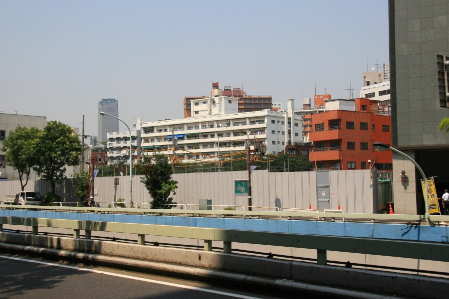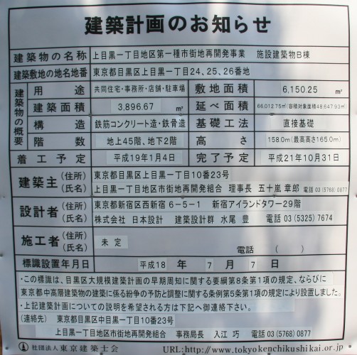中目黒駅から撮影。右側のフェンスで囲まれた部分が建設現場です。後ろに見えているビルは地上39階、高さ167mの恵比寿ガーデンプレイスタワーです。これと同じくらいの高さになるようです。すぐ目の前に建つ中目黒GTは地上25階、高さ120m、隣駅の代官山駅の目の前に建つタワーマンション、代官山アドレス ザ・タワーは地上36階、高さ119.9mなのでかなり目立つ建物になりそうです。 | |
