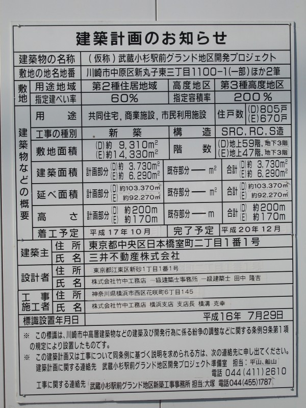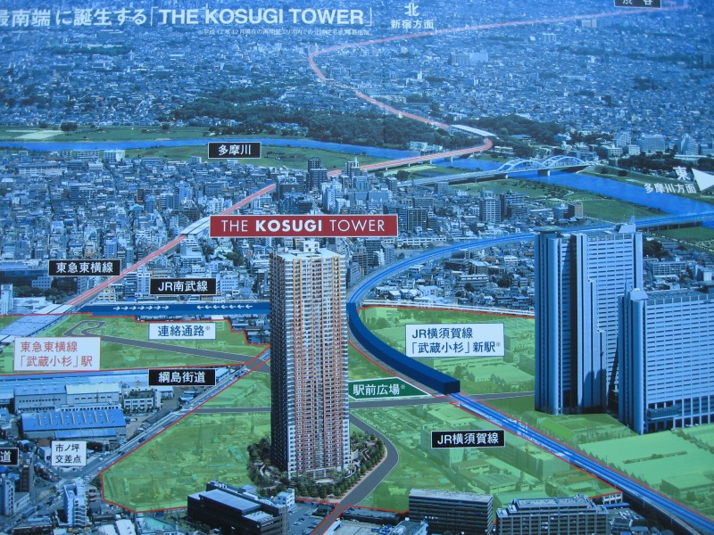 上の写真は、現在位置と同じような場所から撮ったので右側にTHE KOSUGI TOWERが建つことになります。また、この概要図からわかるように、この区画だけでも、他にタワーマンションが2棟建ちます。 | |
