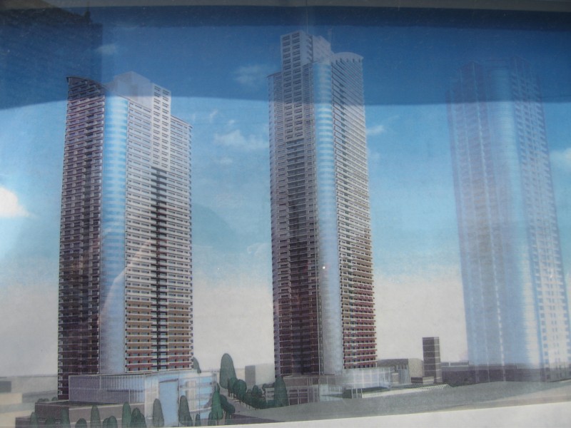 現地看板の完成予想図です。この図では1棟しかタワーマンションがありませんが、何本も超高層マンションが建ちます。 | |