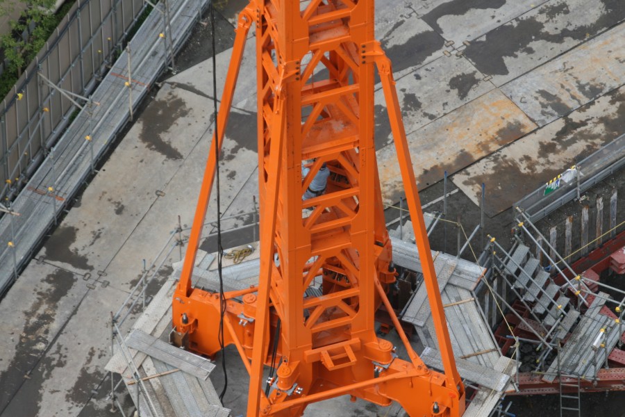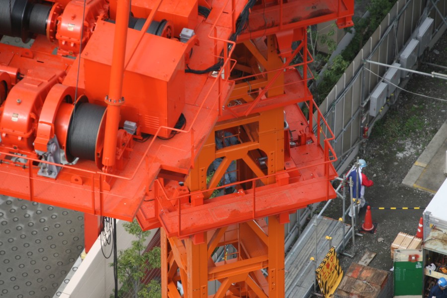 タワークレーンにはどうやって登るのか?そんな疑問を解決するために20分ほどカメラを構えて待っていました。ハシゴでした。命綱を付けて登って行きます。 | |