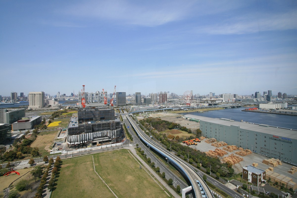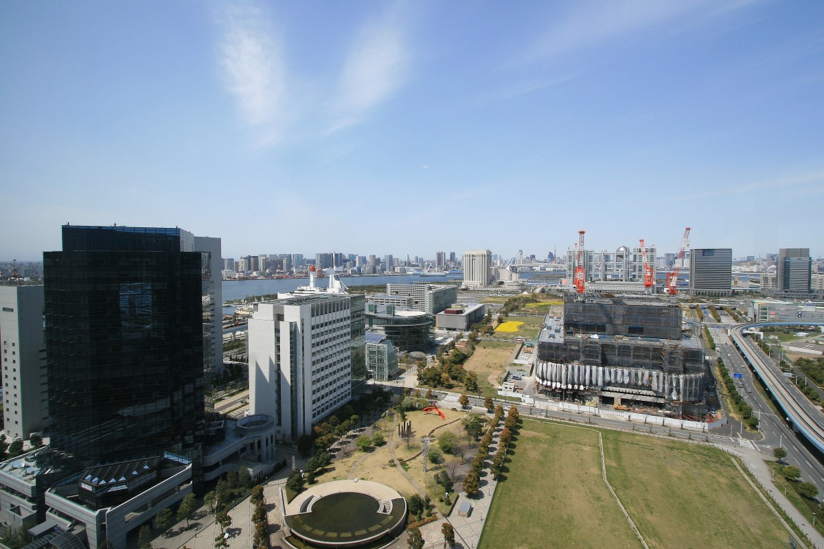 テレコムセンタービル(地上21階、塔屋1階、地下3階、高さ99m)からの眺めラストです!テレコムセンタービルの東棟が展望室になっています。北側からはこのようにお台場が一望出来ます。