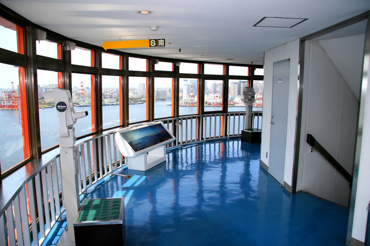 展望塔の中です。ガラガラで展望塔にいる間は一組の親子しか来ませんでした。ちなみに展望塔に入るには本館券(大人700円)が必要です。本館券がなくても行けそうな感じがしましたが、係員に聞いたら必要とのことでした。船の科学館の本館もちらっと見て来ましたが、船の模型が多数あり意外と楽しめそうでした。 |
