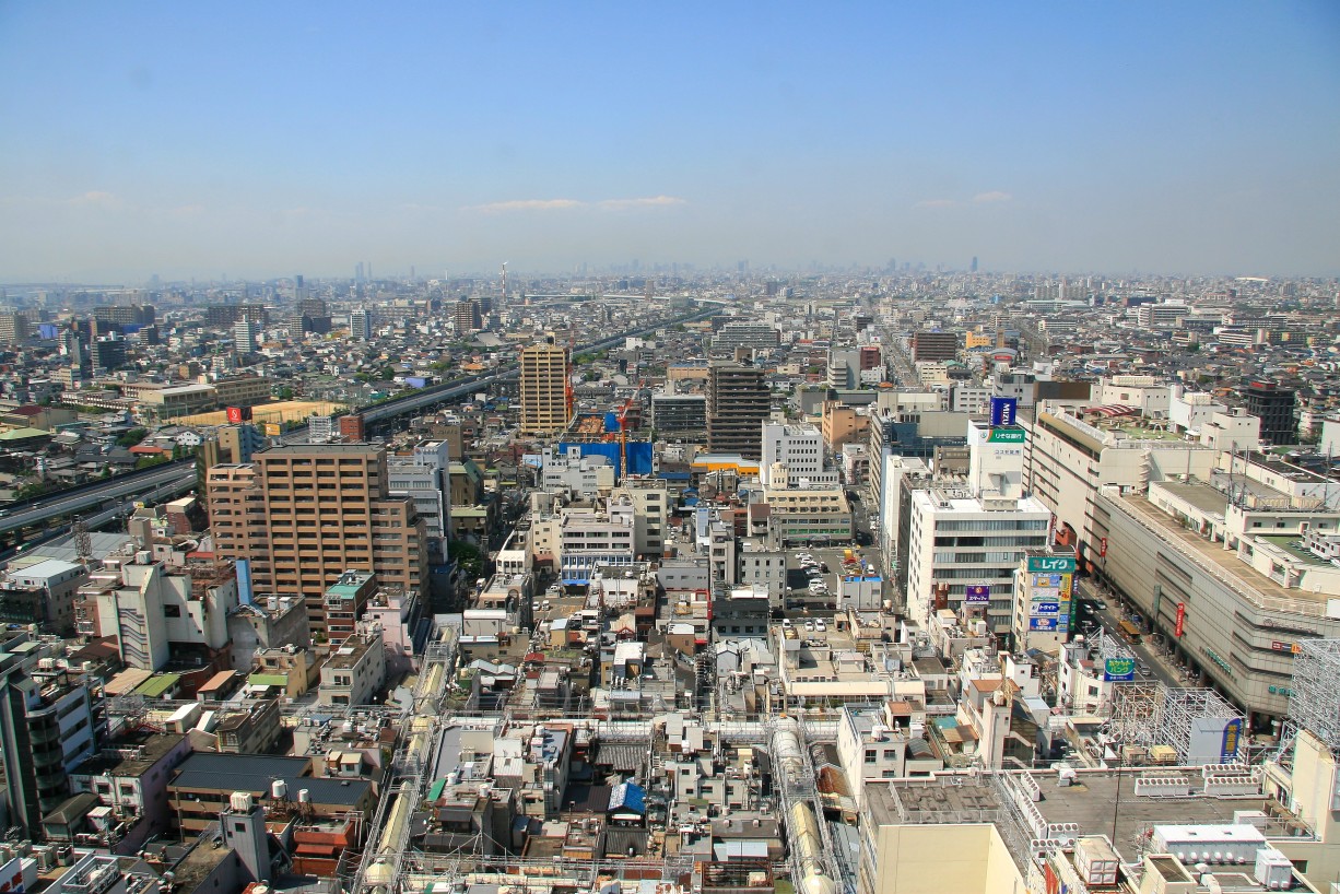 大阪市方面です。大阪都心部の超高層ビル群を眺めるにはちょっと遠いですね。でも堺市役所は南海高野線の堺東駅のすぐ近くなので、迷わず気軽に行くことが出来ます。 |