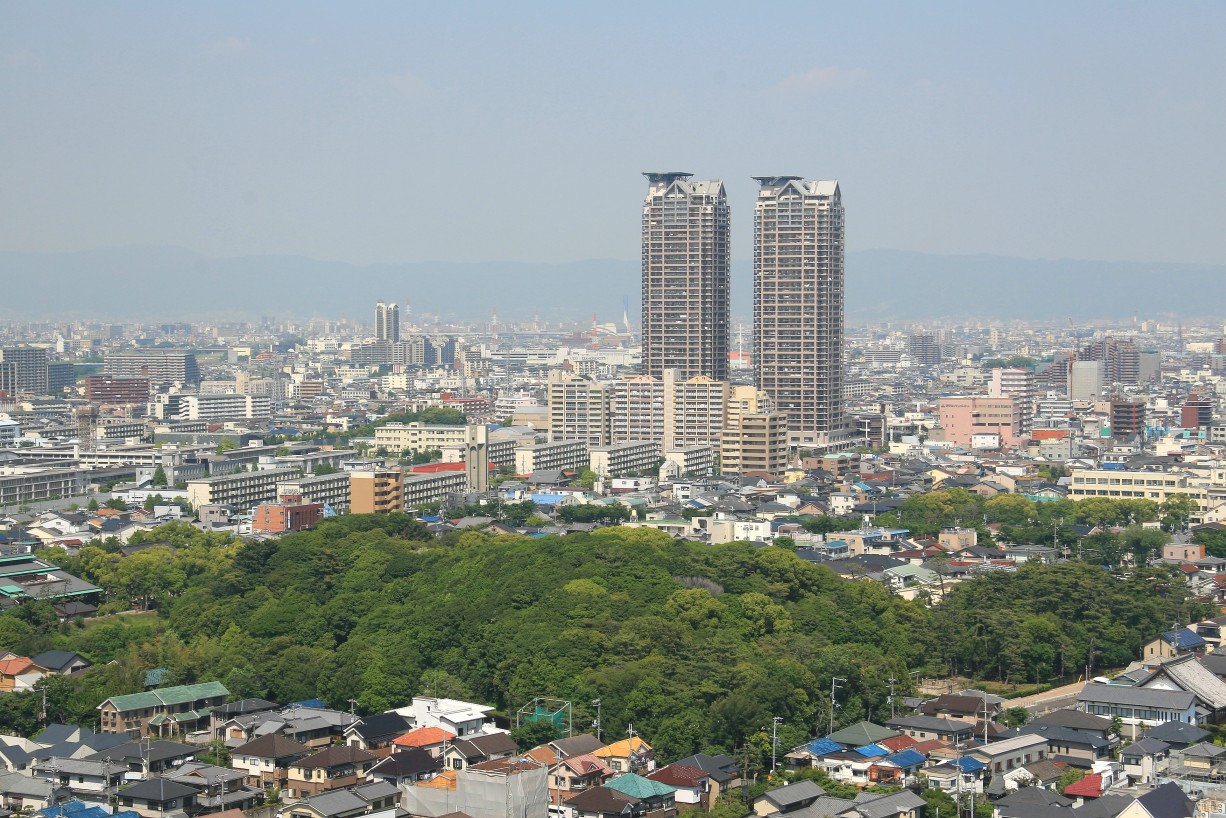 堺市駅方面です。森の向こうに見えるツインタワーは地上43階の超高層マンション、べルマージュ堺です。手前の緑は反正天皇陵で前方後円墳の古墳です。 | |