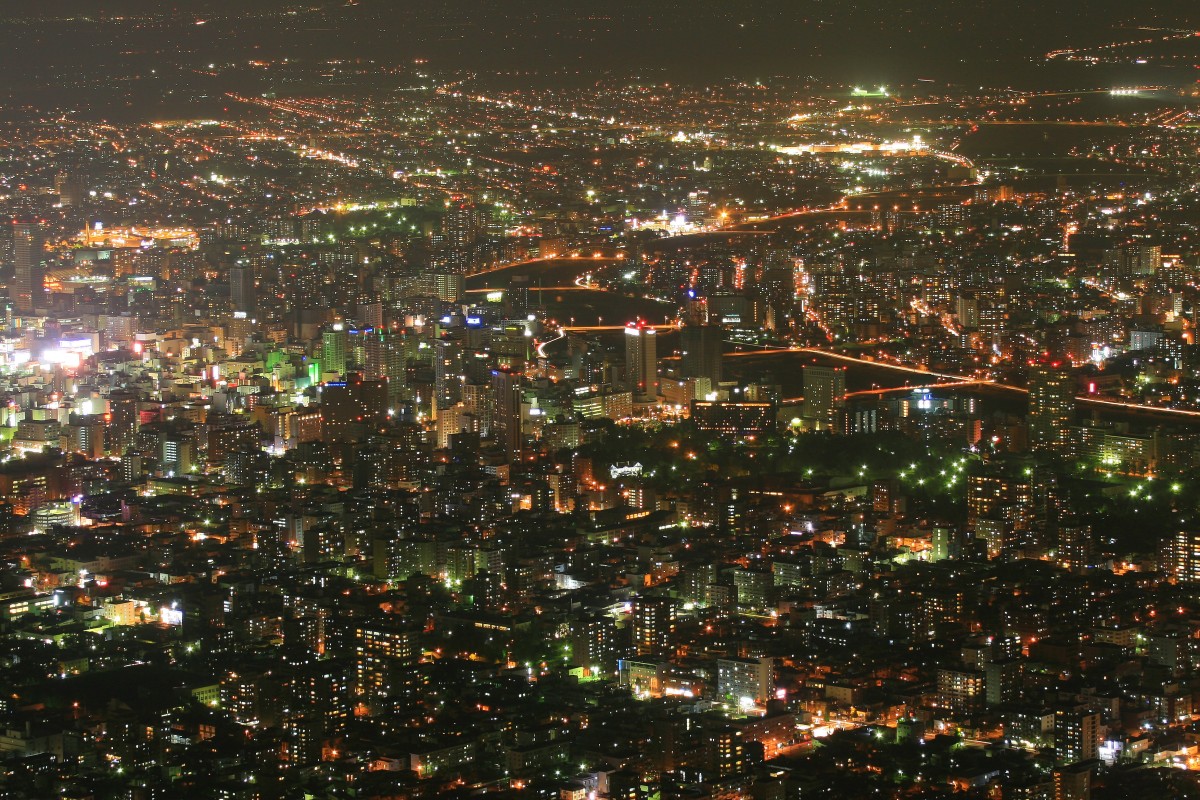 ススキノ、中島公園方面です。左側の明るいところがすすきのです。ススキノの右側から豊平川にかけてが中島公園です。この地区にはタワーマンションや割りと背の高いホテルが何棟かあります。超高層の少ない札幌では、これでも有数の超高層密集地帯です。 |