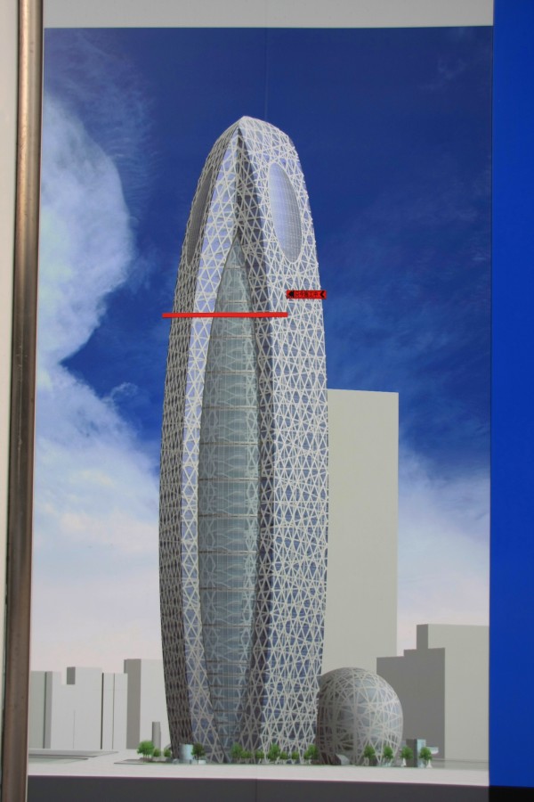 現在の進行図です。地上50階、高さ203.65mまであともう一息ですね。今後は最上部の目のような部分の建設に入って行きそうです。 |