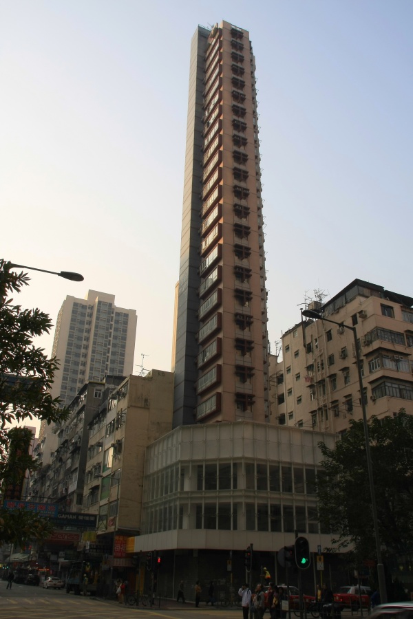 香港のモンコック駅近くで見つけたペンシルビルです。こちらも25階建てくらいでしょうか。こっちの方は新しそうなのであまり不安な感じはしません。これは1フロア1戸のマンションですかね? |