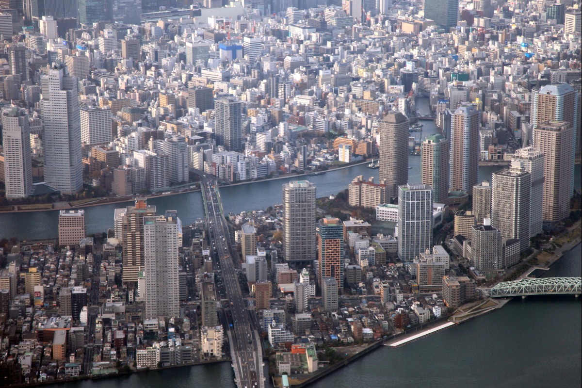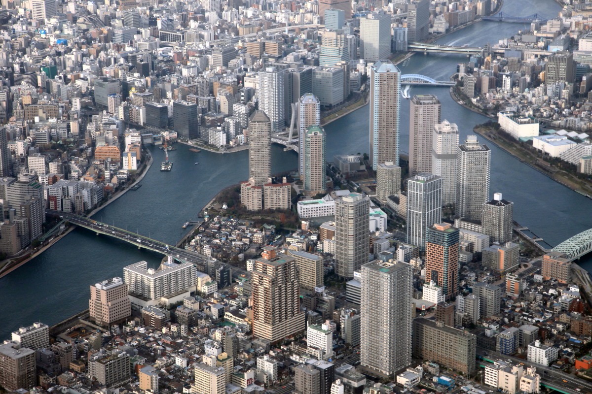 ヘリコプターから見た「リバーシティ21」と「月島」の超高層マンション群です。 右上から左下にかけて流れている川が「隅田川」で 右下に流れているのが「晴海運河」です。 その「隅田川」と「晴海運河」に挟まれた三角地帯の先の方が 「リバーシティ21」と呼ばれる地区のタワーマンション群です。 縦の白い線が入ったマンションが 「ザ・クレストタワー」(地上32階、高さ109.1m)で ここからは「リバーシティ21」ではありません。 |