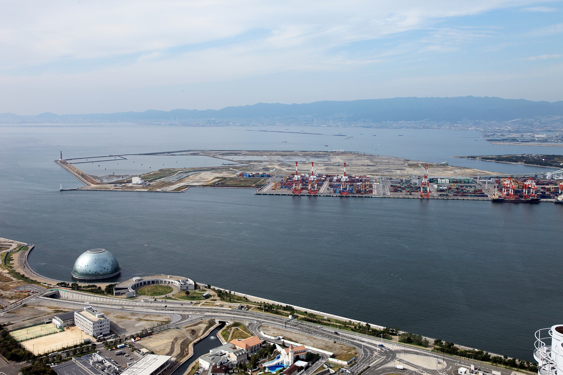約5年前の空撮です。弁天町の超高層ビル群の背後に薄っすらとキリンが見える場所が夢洲です。夢洲の右手前にUSJがあります。右奥に見えるタワーのようなものは夢洲のとなりの舞洲のゴミ処理場の煙突です。