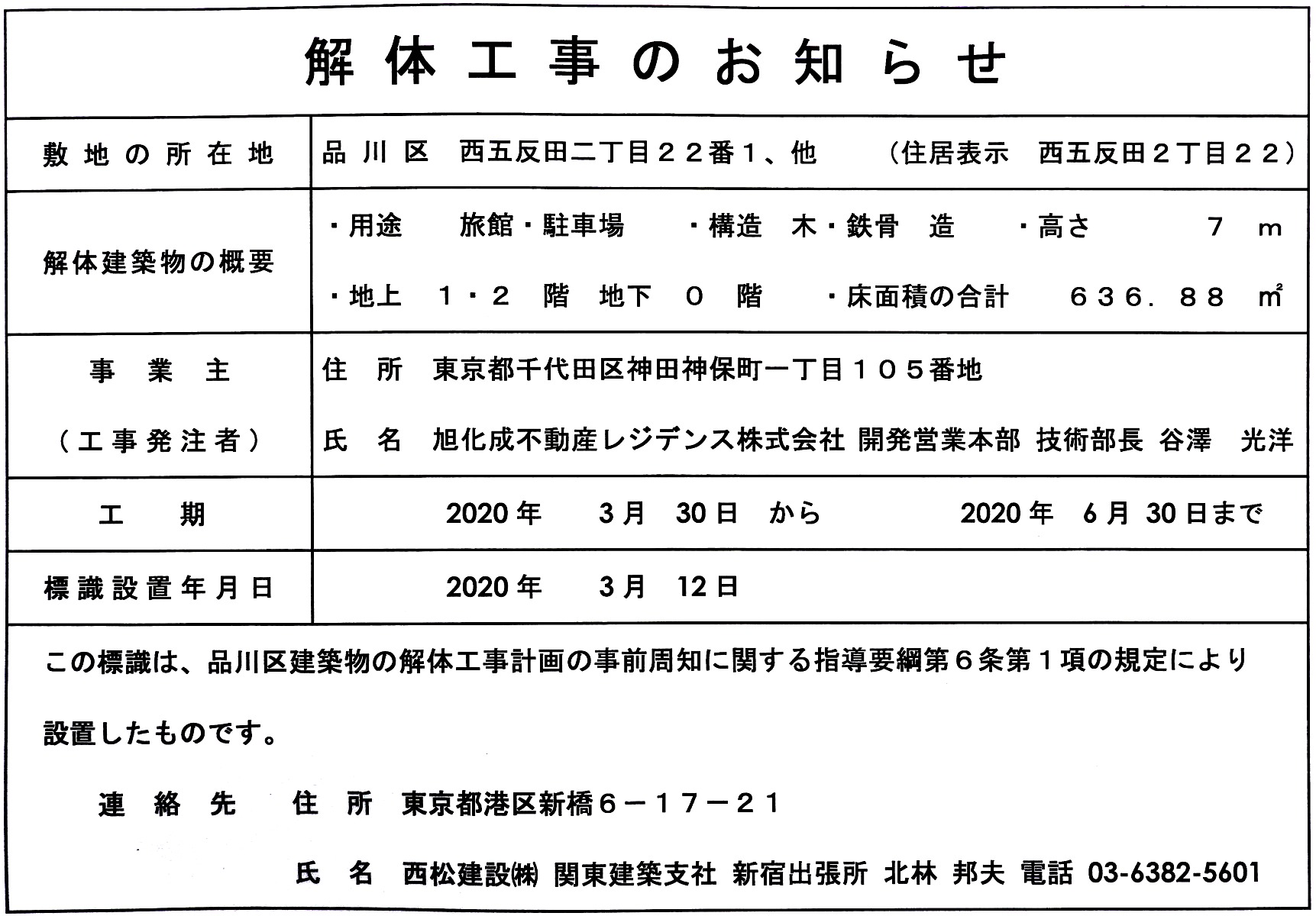 事業主は旭化成不動産レジデンス、解体工事は西松建設によって2020年3月30日〜2020年6月30日までの工期で行われています。