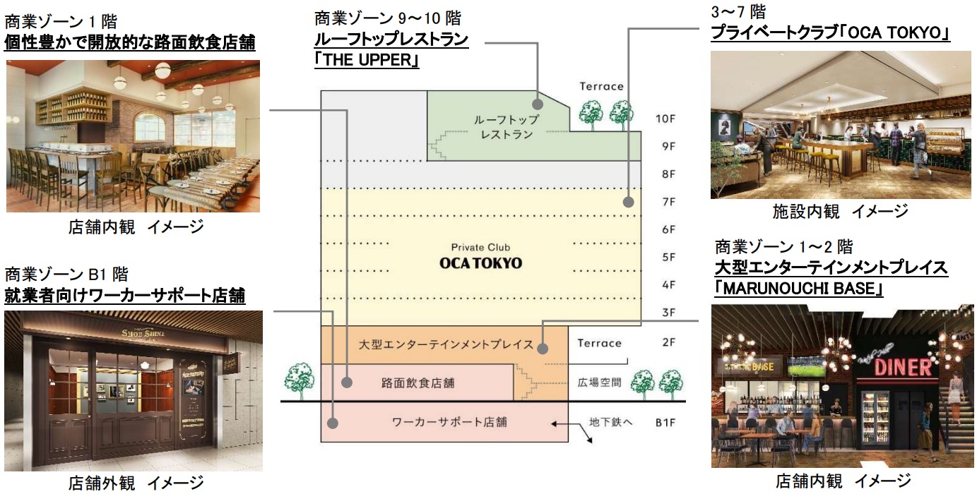 ¡¡¥Õ¥í¥¢¹½À®¤Ï¤³¤Î¤è¤¦¤Ë¤Ê¤Ã¤Æ¤ª¤ê9¡Á10³¬¤Ë¤Ï¥ë¡¼¥Õ¥È¥Ã¥×¥ì¥¹¥È¥é¥ó¤â¤¢¤ê¤Þ¤¹¡£1¡Á2³¬¤ËÆþ¤ëÂç·¿¥¨¥ó¥¿¡¼¥Æ¥¤¥á¥ó¥È¥×¥ê¥¹¡ÖMARUNOUCHI BASE¡×¤Ï¡Ø¥Æ¥é¥¹¤È°ìÂ⽤·¤¿Å¹Æâ¤Ï¸Þ´¶¤Ç´¶¤¸¤ë¥Ë¥å¡¼¥¢¥á¥ê¥«¥ó¥À¥¤¥Ê¡¼¤ËºÇ¿·±Ô¤Î¥«¥é¥ª¥±¤ä¥À¡¼¥Ä¤Ê¤É¤ÎÀßÈ÷¤ò»ý¤Ã¤¿¥¨¥ó¥¿¥á¥¨¥ê¥¢¤¬Ê»Àߡ٤ȤΤ³¤È¤Ç¤¹¡£