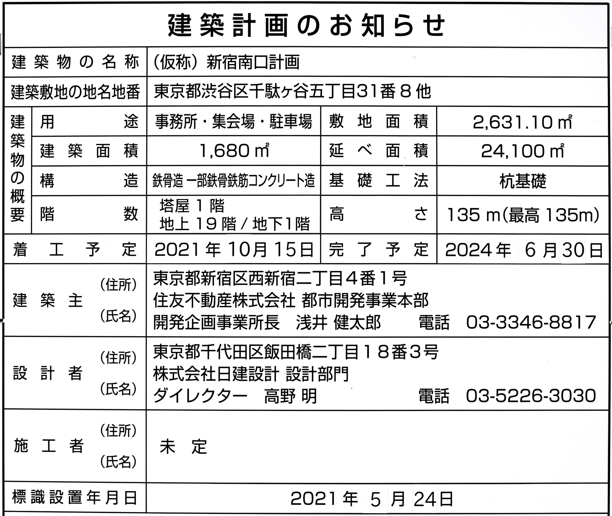 ¡¡¿·½É±Ø¶á¤¯¤Î½Âë¶èÀéÂÌ¥ö룵ÃúÌܤǽ»Í§ÉÔÆ°»º¤Ë¤è¤ë¥ª¥Õ¥£¥¹¥Ó¥ë¡Ö(²¾¾Î)¿·½ÉÆî¸ý·×²è¡×(ÃϾå19³¬¡¢¹â¤µ135m)¤¬·úÀߤµ¤ì¤ë¤³¤È¤¬È½ÌÀ¤·¤Þ¤·¤¿¡£¤³¤ì¤Ï2015ǯ1·î¤Î¶õ»£¤Ç¤¹¤¬¼Ì¿¿±¦²¼¤ÎÀÖ¤¤Ìֳݤ±¤ò¤·¤¿¾ì½ê¤¬·úÀßÃϤǡ¢ÉßÃÏÌÌÀÑ2,631.10Ö¤ËÂФ·¤Æ·úÃÛÌÌÀÑ1,680Ö¡¢±ä¾²ÌÌÀÑ24,100֤Ȥʤê¤Þ¤¹¡£2021ǯ10·î15ÆüÃ幩¡¢2024ǯ6·î30Æü½×¹©Í½Äê¤Ç¤¹¡£