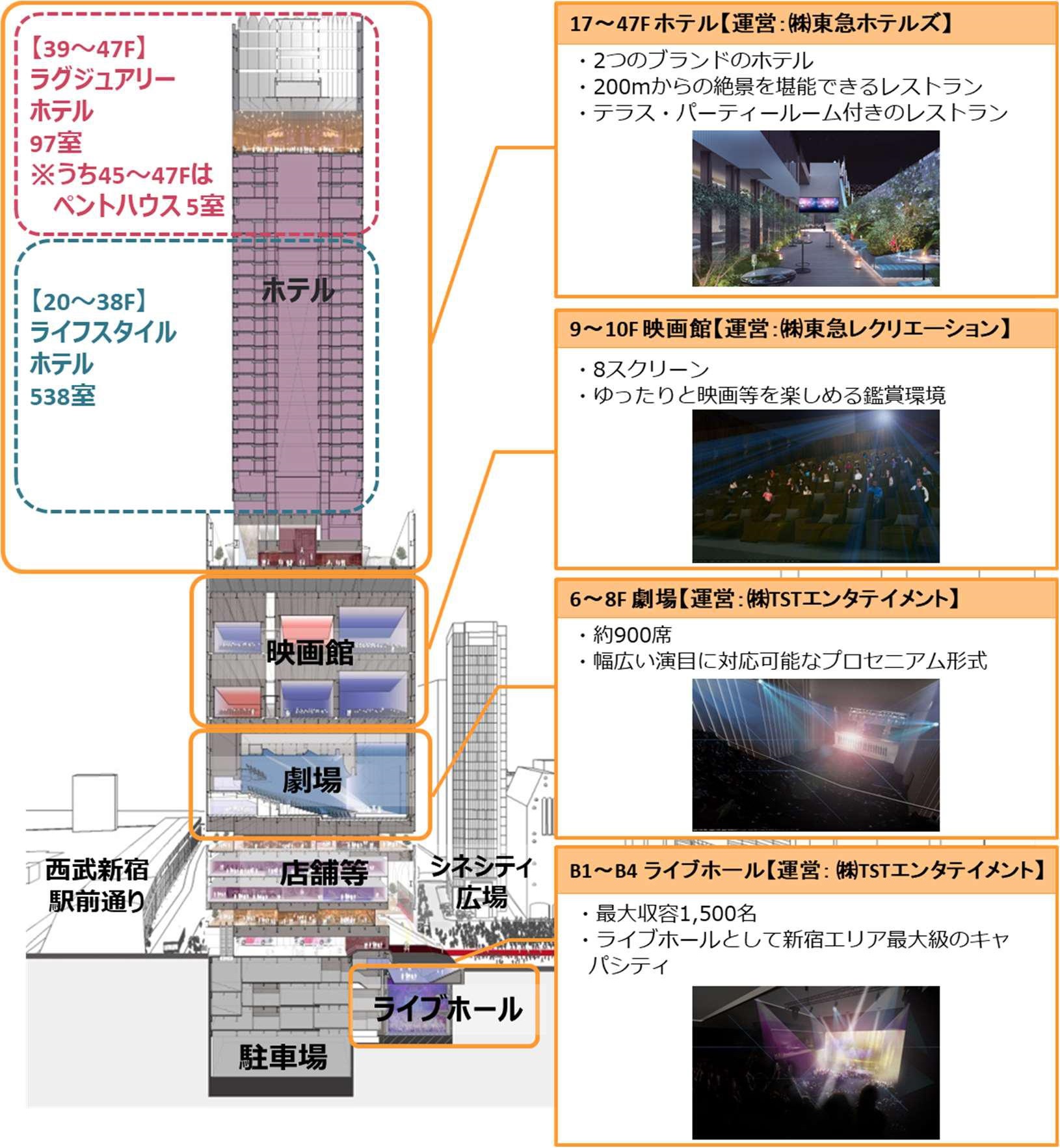 ¡¡¥Õ¥í¥¢¹½À®¤ÏÃϲ¼1³¬¡ÁÃϲ¼4³¬¤¬Ìó1500¿Í¼ýÍÆ²Äǽ¤Ê¥é¥¤¥Ö¥Û¡¼¥ë¡¢1³¬¡Á5³¬¤¬Å¹ÊÞÅù¡¢6³¬¡Á8³¬¤¬Ìó900Àʤηà¾ì¡¢9³¬¡Á10³¬¤¬8¥¹¥¯¥ê¡¼¥ó¤Î±Ç²è´Û¡¢¤½¤·¤Æ17¡Á47³¬¤¬ÅìµÞ¥Û¥Æ¥ë¥º¤¬±¿±Ä¤¹¤ë2¤Ä¤Î¥Ö¥é¥ó¥É¤Î¥Û¥Æ¥ë¤È¤Ê¤ê¤Þ¤¹¡£¹â¤µ200m¤ÎÃÏÅÀ¤Ë¤Ï¥ì¥¹¥È¥é¥ó¤âÇÛÃÖ¤µ¤ì¤Þ¤¹¡£