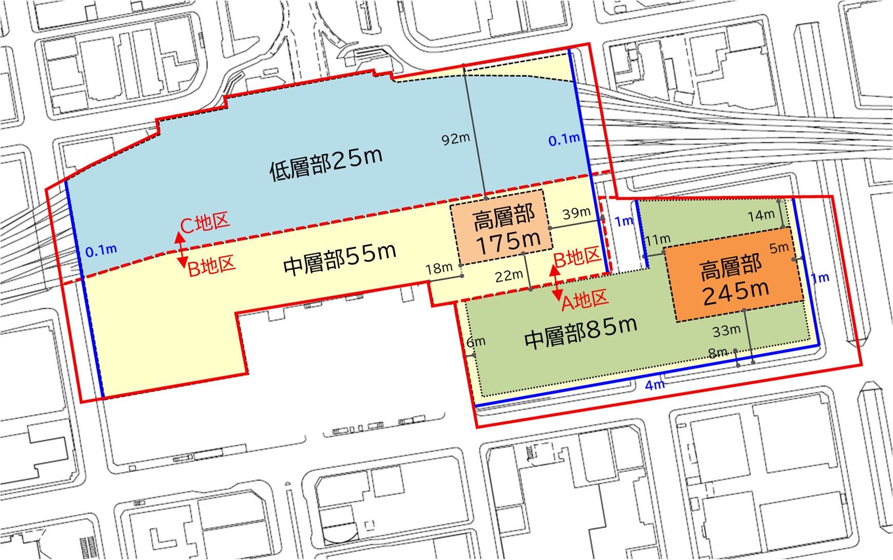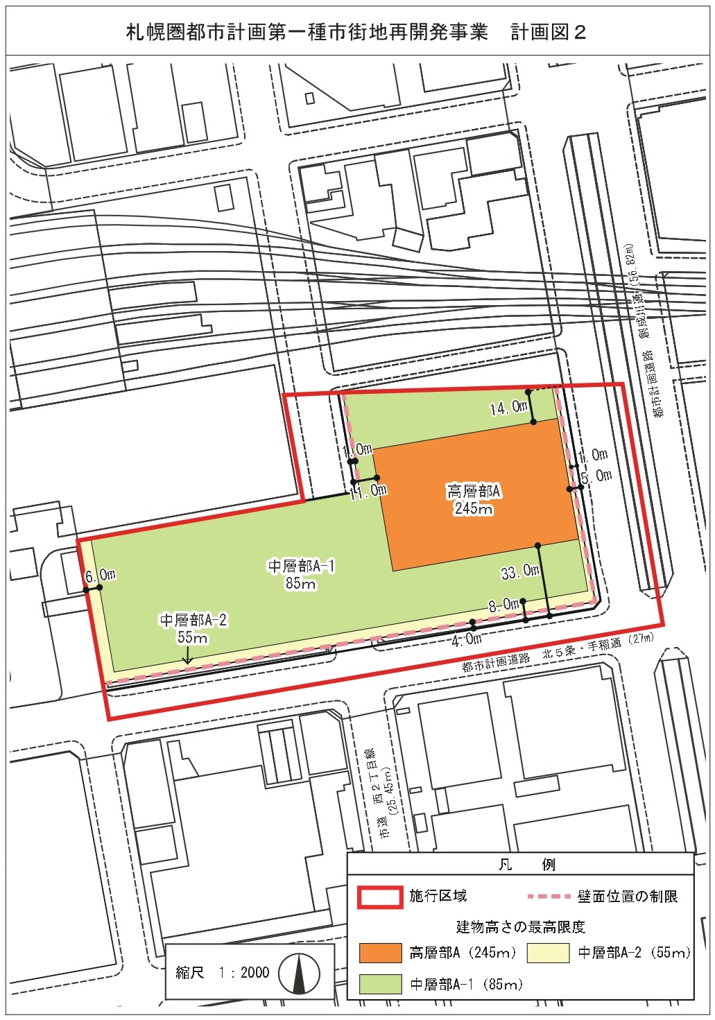 ¡¡¤³¤Î·×²è¿Þ¤ÎAÃ϶褬¡Ö(²¾¾Î)ËÌ5À¾1¡¦À¾2Ã϶èÂè°ì¼ï»Ô³¹ÃϺƳ«È¯»ö¶È¡×¤Î·×²èÃϤǡ¢¾¦¶È»ÜÀߤʤɤ¬Æþ¤ëÃæÁØÉôÉô¤Î¹â¤µ¤Ï85m¡¢¥ª¥Õ¥£¥¹¤ä¥Ï¥¤¥°¥ì¡¼¥É¥Û¥Æ¥ë¤¬Æþ¤ë¹âÁØÉô¤Î¹â¤µ¤Ï245m¤È¤Ê¤ê¤Þ¤¹¡£