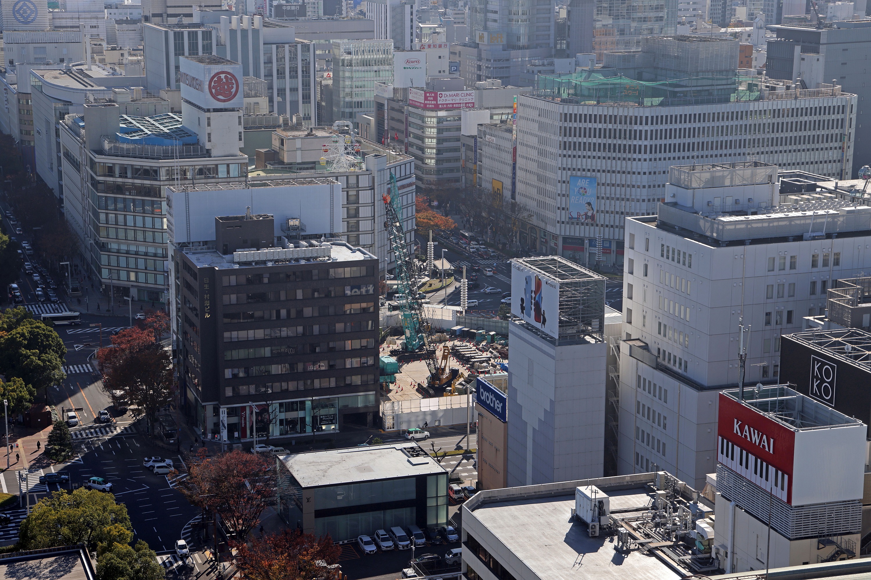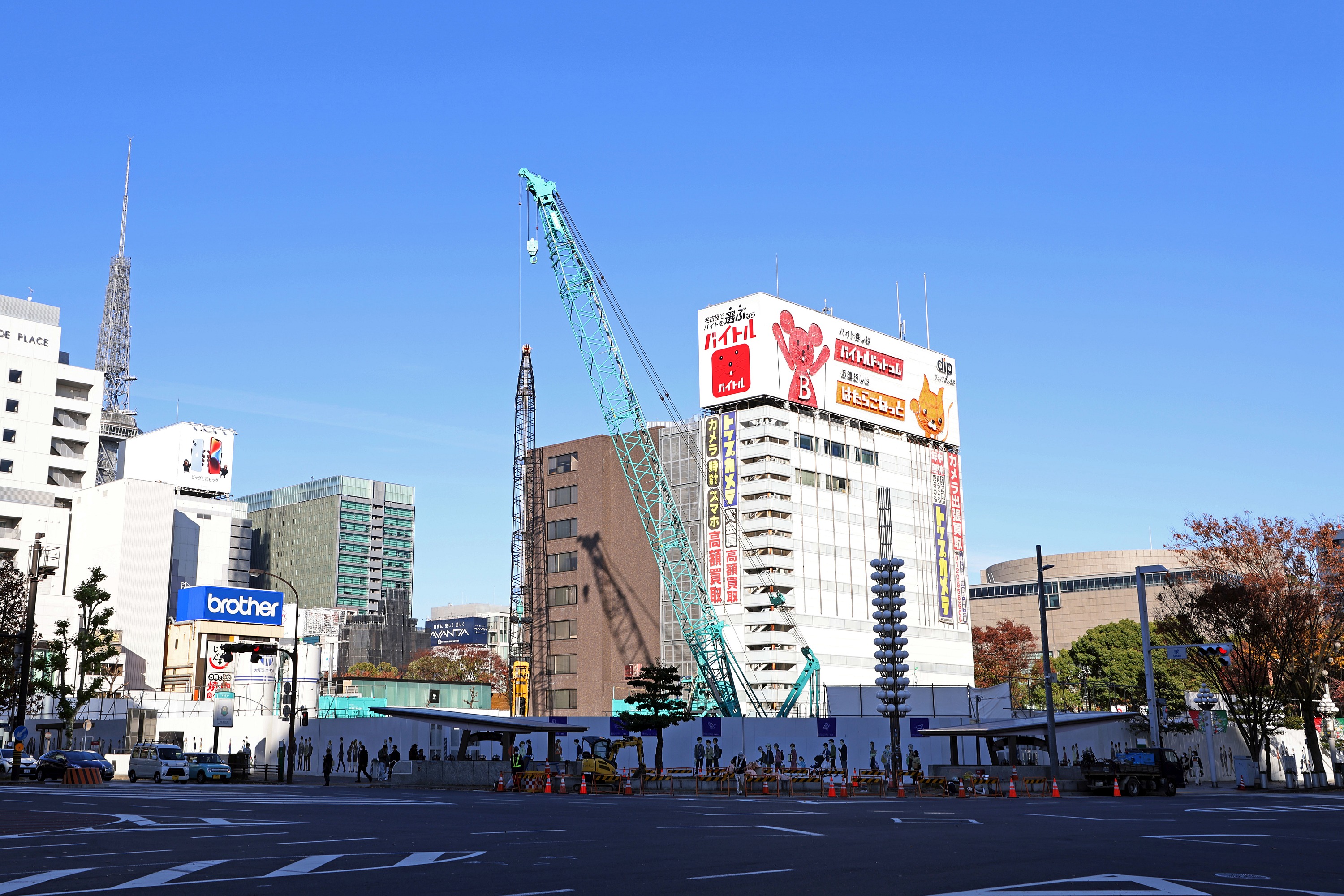 ¡¡º¸¤Î·úÀßÃæ¤Î¥Ó¥ë¤¬¡ÖÃæÆü¥Ó¥ë¡×(ÃϾå33³¬¡¢¹â¤µ158.877m)¤Ç¡¢µ×²°ÂçÄ̸ø±à¤ò¶´¤ó¤À¸þ¤«¤¤Â¦¤Ë¤Ï¡Ö̾¸Å²°»°±Û±Éʡפ¬¤¢¤ê¡¢¤½¤³¤Ç¤Ï¹â¤µ180m¤Î͹âÁØ¥Ó¥ë¤Ë·ú¤ÆÂؤ¨¤ë·×²è¤¬¤¢¤ê¤Þ¤¹¡£
