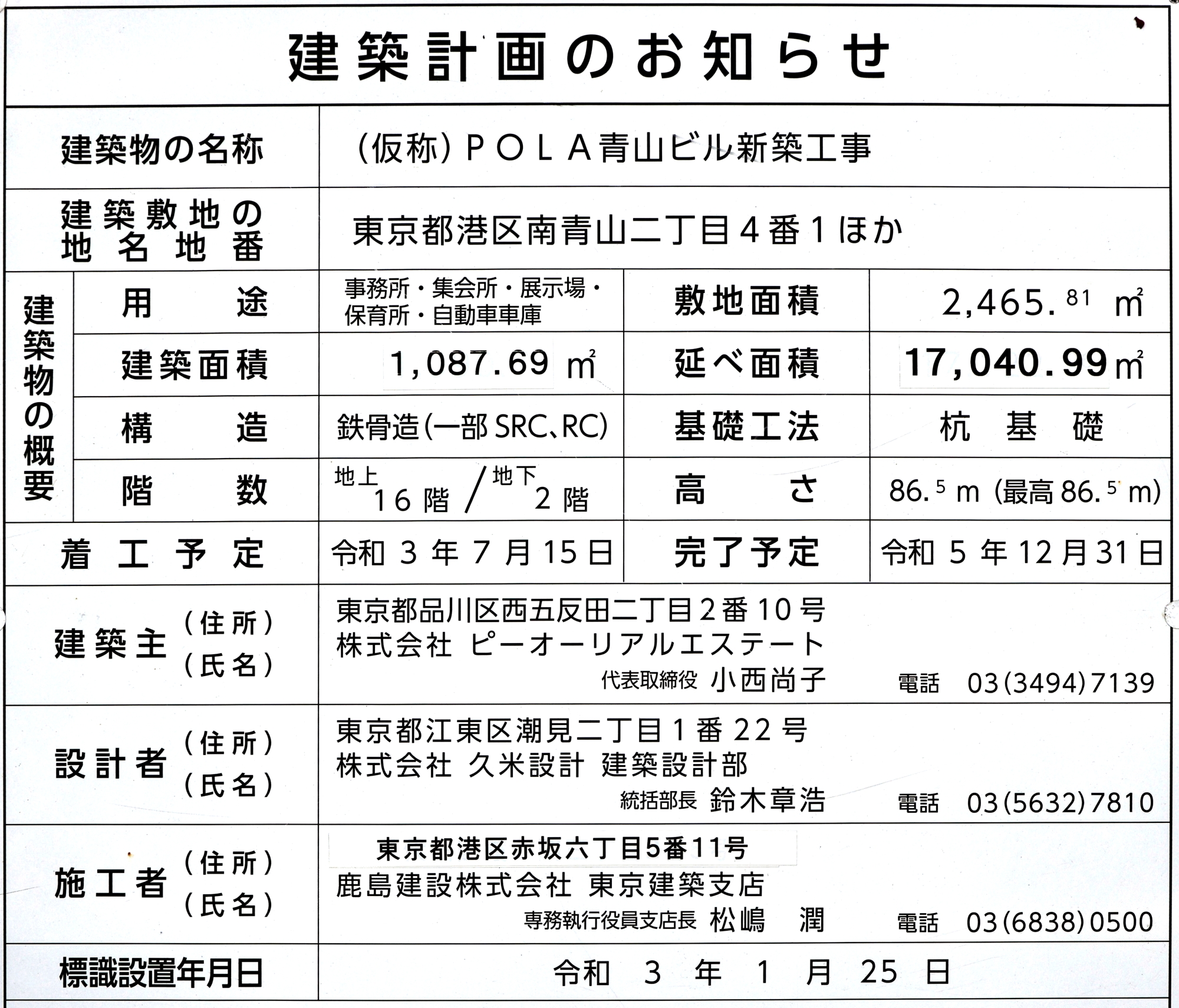 ¡¡¡ÖPOLAÀÄ»³¥Ó¥ë¥Ç¥£¥ó¥°¡×¤ÏÀÄ»³Ä̤ê±è¤¤¤Ç·úÀßÃæ¤Î¥ª¥Õ¥£¥¹¥Ó¥ë¤Ç¡¢µ¬ÌϤÏÃϾå16³¬¡¢Ãϲ¼2³¬¡¢¹â¤µ86.5m¡¢ÉßÃÏÌÌÀÑ2,465.81Ö¡¢·úÃÛÌÌÀÑ1,087.69Ö¡¢±ä¾²ÌÌÀÑ1Ëü7040.99Ö¡¢·úÃÛ¼ç¤Ï¥Ô¡¼¥ª¡¼¥ê¥¢¥ë¥¨¥¹¥Æ¡¼¥È¡¢À߷׼Ԥϵ×ÊÆÀ߷ס¢»Ü¹©¼Ô¤Ï¼¯Åç·úÀߤÇ2023ǯ12·î31Æü½×¹©Í½Äê¤È¤Ê¤Ã¤Æ¤¤¤Þ¤¹¡£