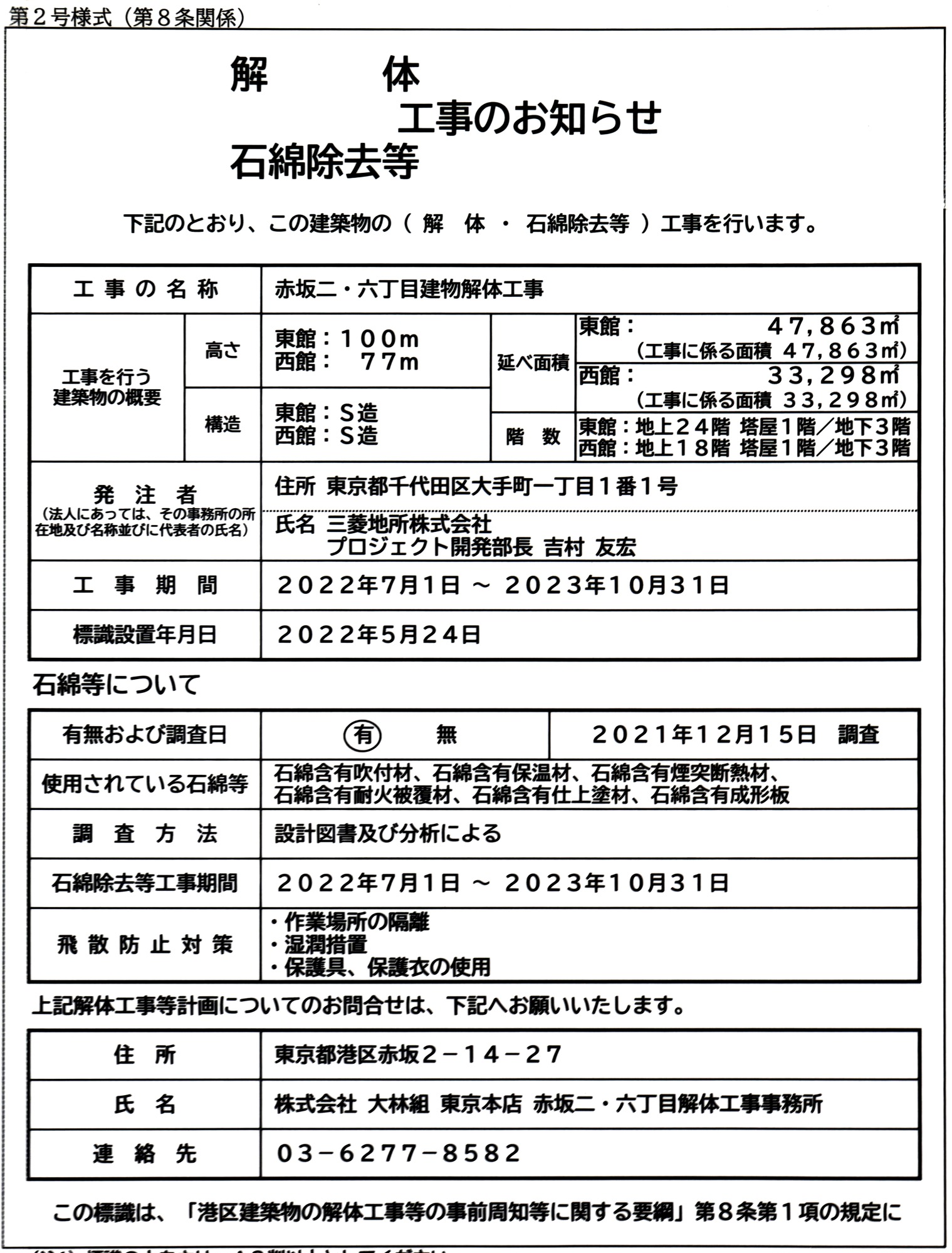 ¡¡¡Ö¹ñºÝ¿·ÀÖºä¥Ó¥ëÀ¾´Û¡×¤È¡Ö¹ñºÝ¿·ÀÖºä¥Ó¥ëÅì´Û¡×¤Î²òÂι©»ö¤Î¤ªÃΤ餻¤Ç¤¹¡£²òÂι©»ö¤Î»Ü¹©¼Ô¤ÏÂçÎÓÁȤǡ¢²òÂι©´ü¤Ï2022ǯ7·î1Æü¡Á2023ǯ10·î31Æü¤Þ¤Ç¤È¤Ê¤Ã¤Æ¤¤¤Þ¤¹¡£