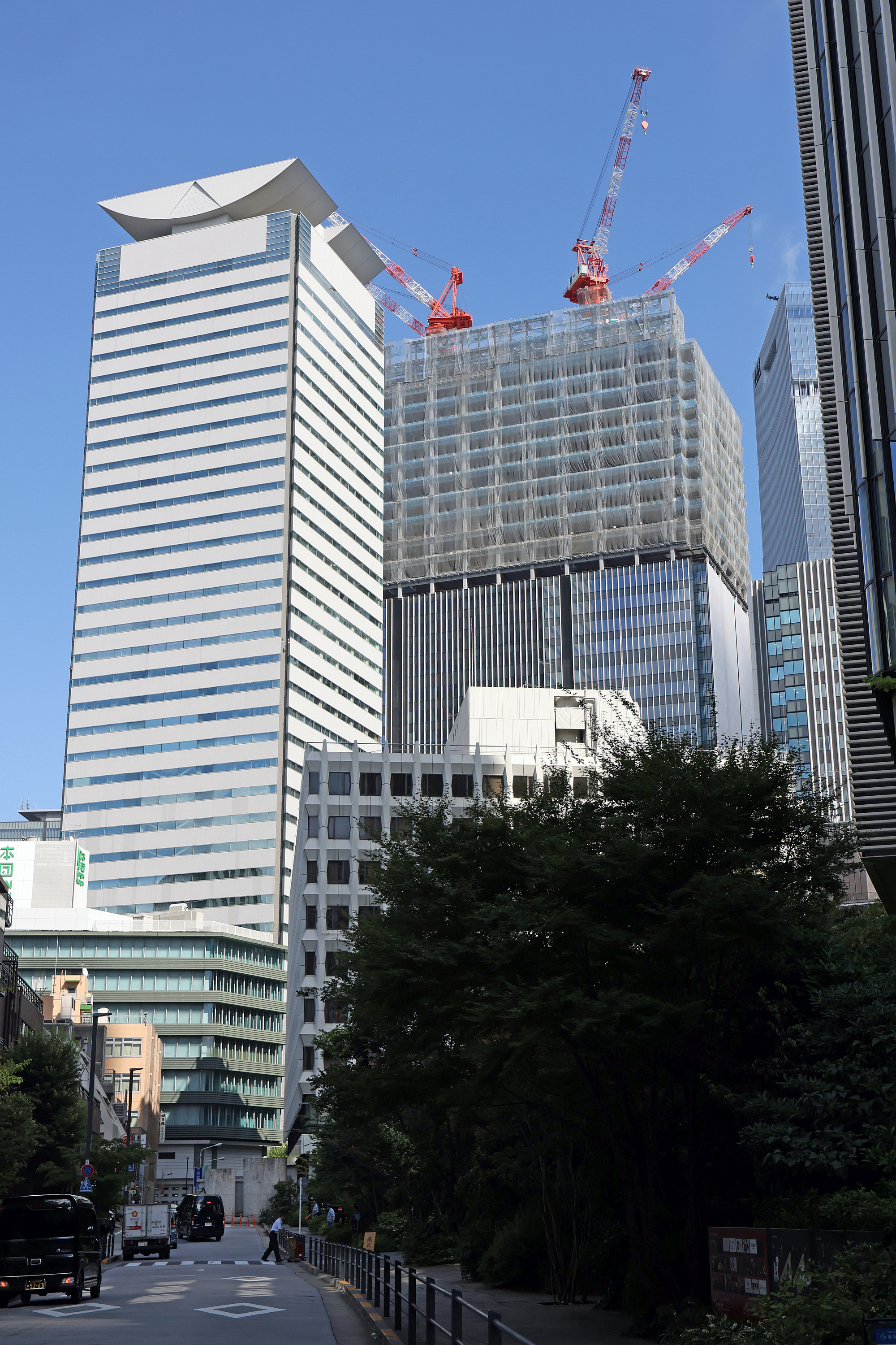 ¡¡¤Þ¤¿¡¢¼êÁ°¤Î¥Á¥é¥Ã¤È¸«¤¨¤Æ¤¤¤ë¡Ö»°²ñƲ¥Ó¥ë¡×(ÃϾå9³¬¡¢¹â¤µ43.6m)¤Ï¡Ö»°²ñƲ¥Ó¥ë¿·ÃÛ¹©»ö¡×(ÃϾå19³¬¡¢¹â¤µ94m)¤È¤·¤Æ·úÂØ¤¨¹©»ö¤¬¹Ô¤ï¤ì¤Þ¤¹¡£