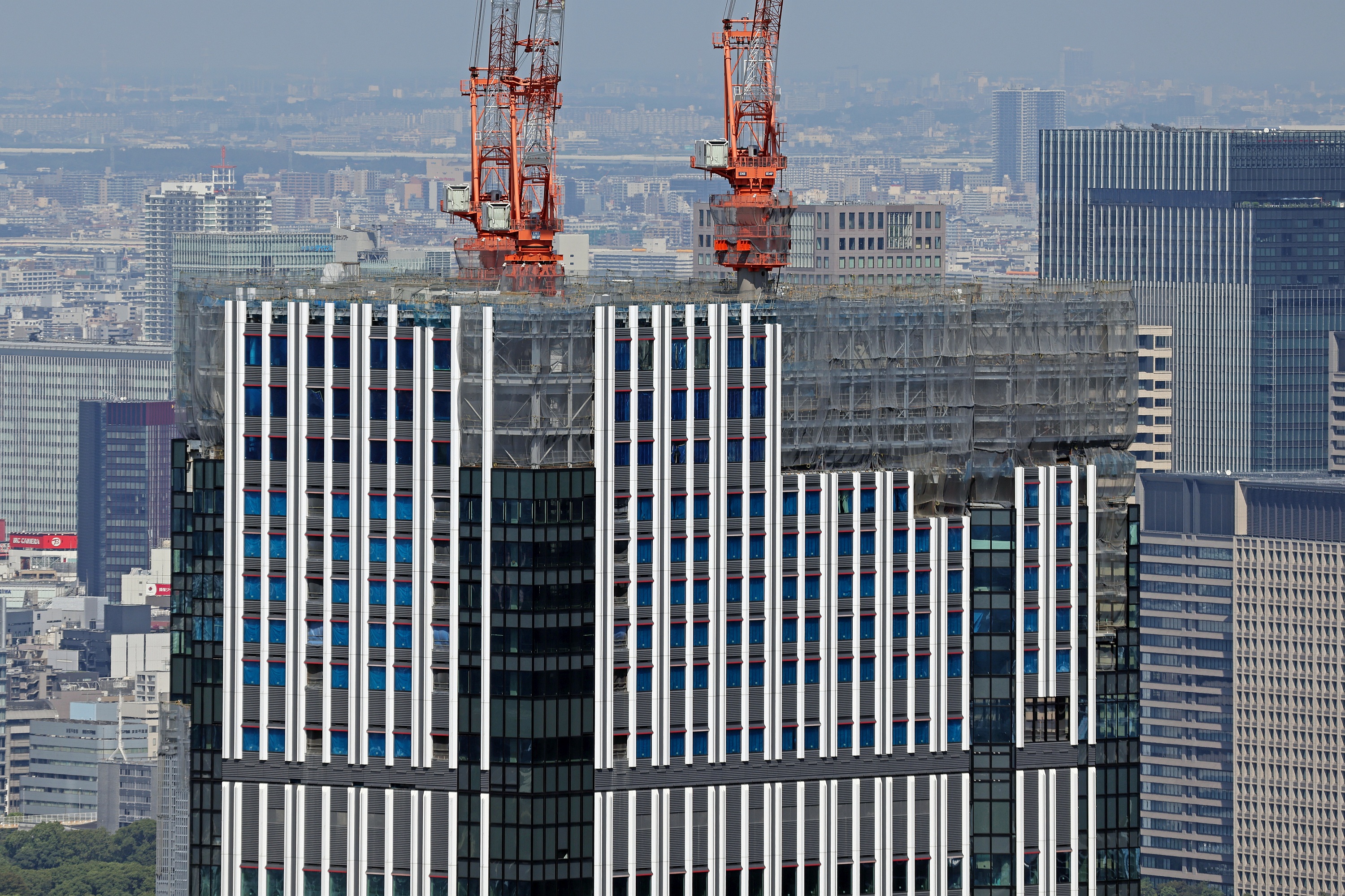 ¡¡Î٤ξ줬ÁÈ¤Þ¤ì¤Æ¤¤¤ë¥Ó¥ë¤¬¡ÖNTTÀÖºä±Ä¶È½ê¡×(ÃϾ壷³¬¡¢¹â¤µ34m)¤Ç³°ÊÉÈþÁõ²½¤Î¹©»ö¤¬¼Â»ÜÃæ¤Ç¤¹¡£