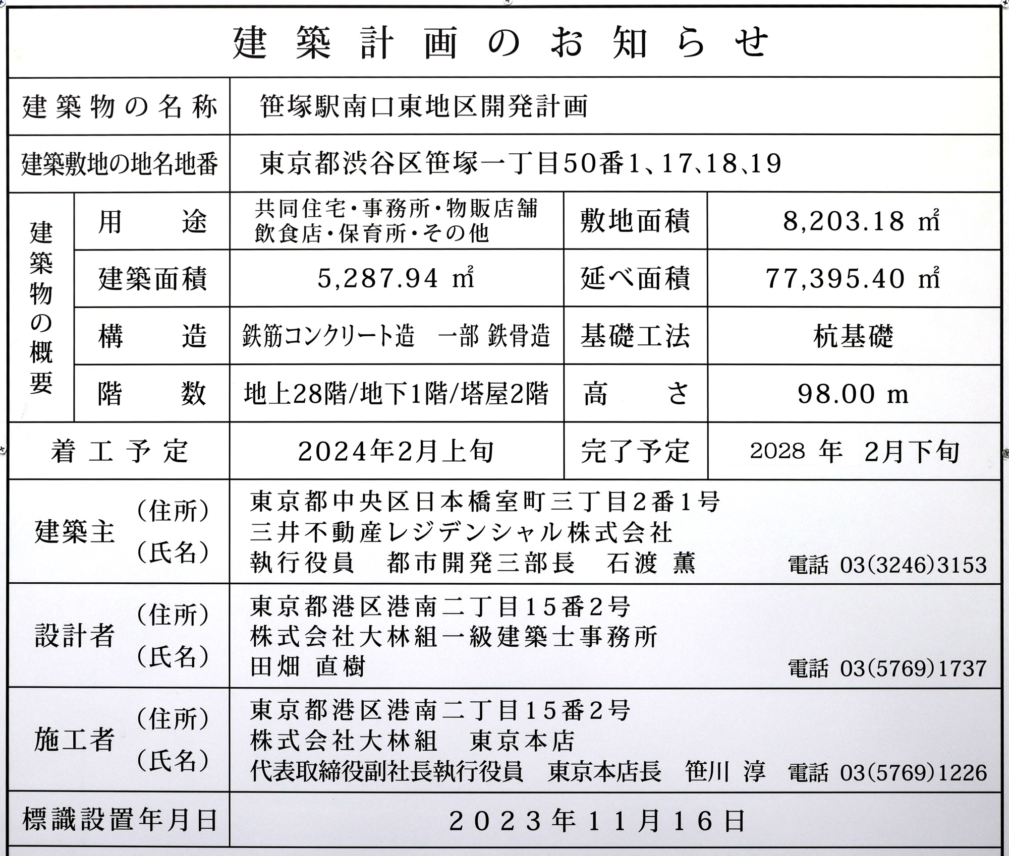 ¡¡2023ǯ11·î28Æü¤ËÆîÀ¾Â¦¤«¤é»£±Æ¤·¤¿¡ÖºûÄÍ±ØÆî¸ýÅìÃÏ¶èºÆ³«È¯·×²è¡×(ÃϾå28³¬¡¢¹â¤µ98m)¤Î·×²èÃϤǤ¹¡£
