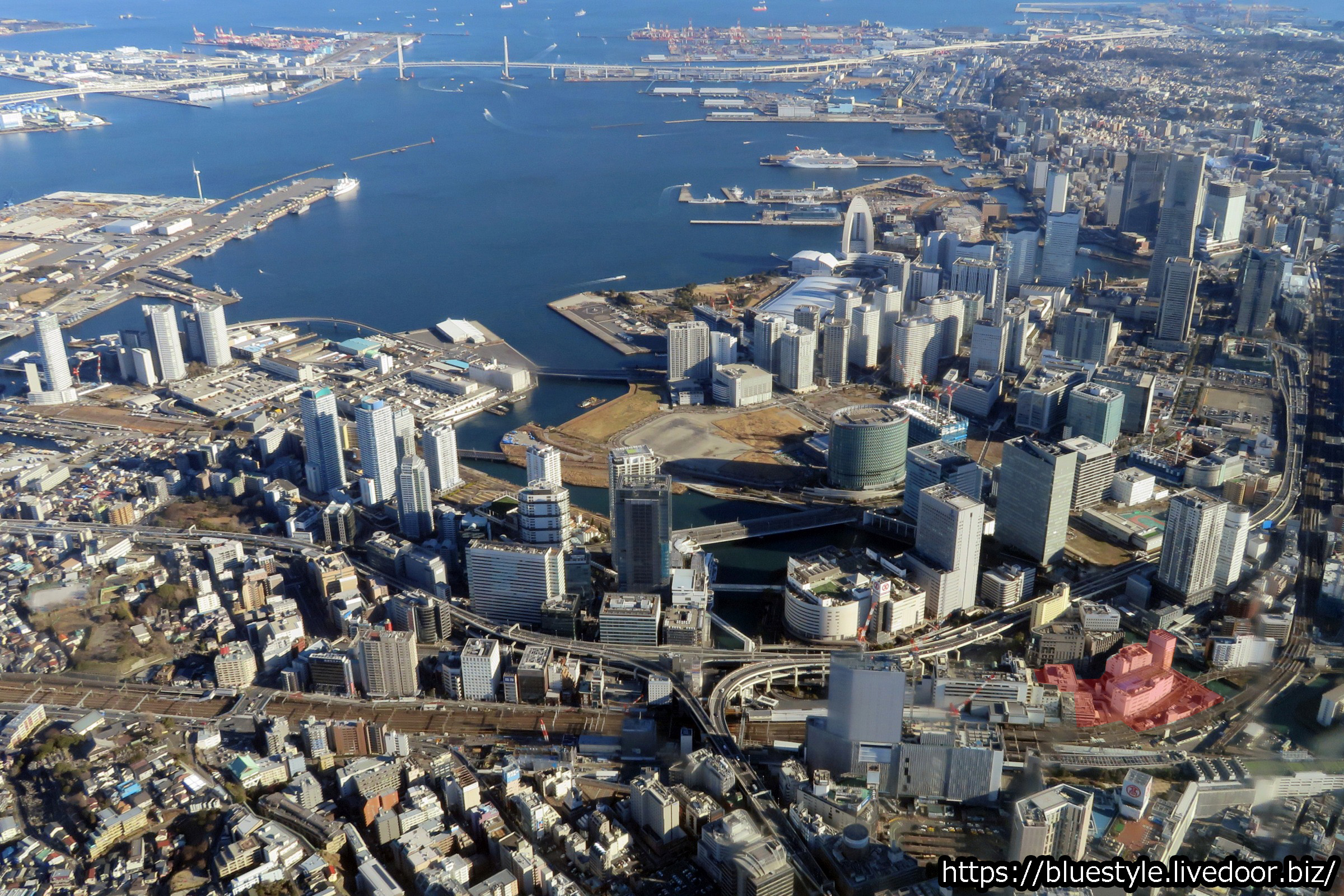少々古いですが2019年1月にセスナから撮影(同乗した友人の撮影)した横浜駅周辺です。右下の赤い網掛けをした場所が「横浜駅みなみ東口地区」の計画地となっています。