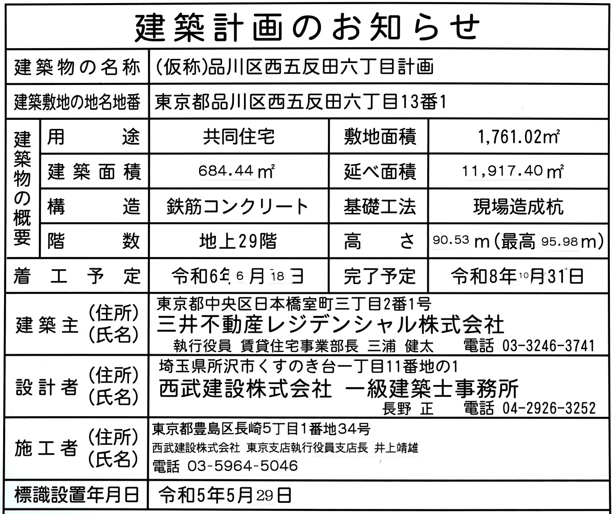 ¡¡¡Ö(²¾¾Î)ÉÊÀî¶èÀ¾¸ÞÈ¿ÅÄÏ»ÃúÌܷײè¡×¤Ï¡Ö¥Û¥Æ¥ë¥ë¡¼¥È¥¤¥ó¸ÞÈ¿ÅÄ¡×À×ÃϤΥ¿¥ï¡¼¥Þ¥ó¥·¥ç¥ó¤Ç¡¢µ¬ÌϤÏÃϾå29³¬¡¢¹â¤µ90.53m¡¢ºÇ¹â¹â¤µ95.98m¡¢ÉßÃÏÌÌÀÑ1,761.02Ö¡¢·úÃÛÌÌÀÑ684.44Ö¡¢±ä¾²ÌÌÀÑ1Ëü1917.40Ö¡¢·úÃÛ¼ç¤Ï»°°æÉÔÆ°»º¥ì¥¸¥Ç¥ó¥·¥ã¥ë¡¢À߷׼ԤȻܹ©¼Ô¤ÏÀ¾Éð·úÀß¡¢½×¹©Í½Äê¤Ï2026ǯ10·î31Æü¤È¤Ê¤Ã¤Æ¤¤¤Þ¤¹¡£