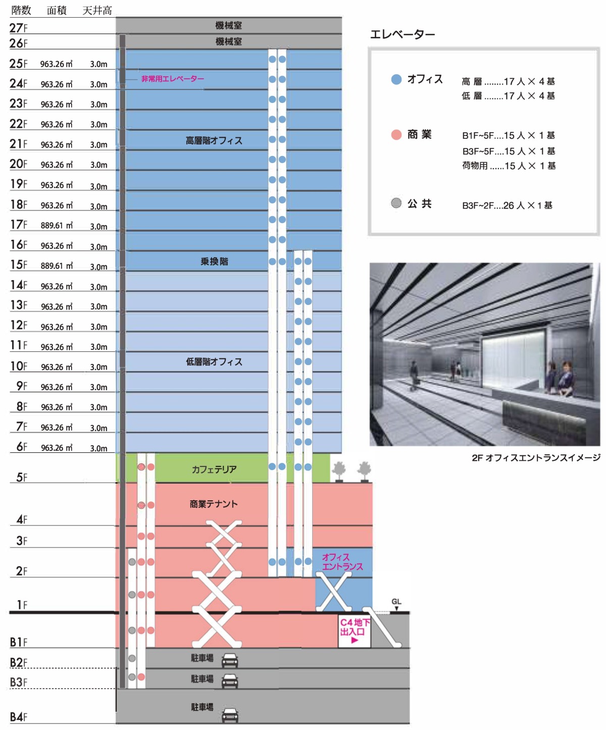 ¡¡¥Õ¥í¥¢¹½À®¤ÏÃϲ¼4³¬¡ÁÃϲ¼2³¬¤¬Ãó¼Ö¾ì¡¢Ãϲ¼1³¬¤«¤éÃϾå4³¬¤¬¾¦¶È»ÜÀß¡¢5³¬¤¬¥«¥Õ¥§¥Æ¥ê¥¢¡¢6³¬¡Á25³¬¤¬¥ª¥Õ¥£¥¹¥Õ¥í¥¢¤Ç¡¢26³¬¤È27³¬¤Ïµ¡³£¼¼¤È¤Ê¤ê¤Þ¤¹¡£