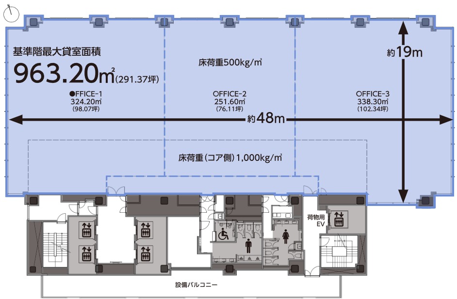 ¡¡¥ª¥Õ¥£¥¹¥Õ¥í¥¢¤Î´ð½à³¬ºÇÂçÂß¼¼ÌÌÀѤÏ963.20Ö¡Ê291.37Äڡˤǡ¢ÉýÌó48m¡¢±ü¹Ô¤Ìó19m¤Î̵Ãì¶õ´Ö¤È¤Ê¤ê¡¢¥ª¥Õ¥£¥¹¥Õ¥í¥¢¤Î¥á¥¤¥ó¤Ï´´Àþƻϩ¤ËÌ̤·¤¿Ë̦¤Ë¤Ê¤ê¤Þ¤¹¡£