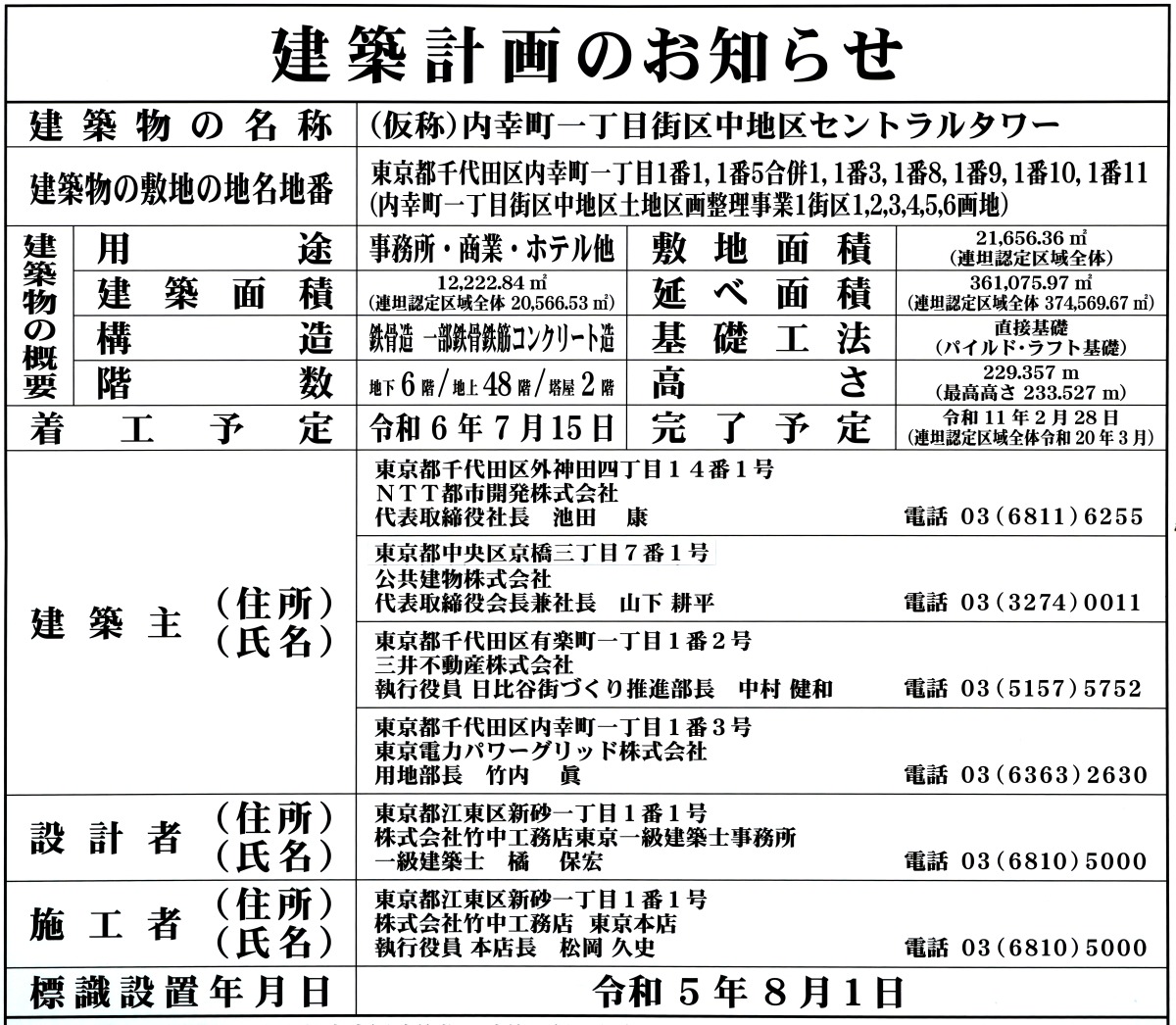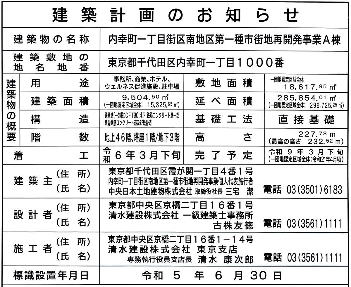 ¡¡¿Þ¤Îº¸Â¦¤ÎÃæÃ϶è¤Ç·úÀßÃæ¤Î¡Ö¥»¥ó¥È¥é¥ë¥¿¥ï¡¼¡Ê(²¾¾Î)Æâ¹¬Ä®°ìÃúÌܳ¹¶èÃæÃ϶襻¥ó¥È¥é¥ë¥¿¥ï¡¼¡Ë¡×¤Îµ¬ÌϤÏÃϾå48³¬¡¢Åã²°2³¬¡¢Ãϲ¼6³¬¡¢¹â¤µ229.357m¡¢ºÇ¹â¹â¤µ233.527m¡¢ÉßÃÏÌÌÀÑ2Ëü1656.36Ö¡ÊϢôǧÄê¶è°èÁ´ÂΡˡ¢·úÃÛÌÌÀÑ1Ëü2222.84Ö¡ÊϢôǧÄê¶è°èÁ´ÂΡ§2Ëü566.53Ö¡Ë¡¢±ä¾²ÌÌÀÑ36Ëü1075.97Ö¡ÊϢôǧÄê¶è°èÁ´ÂΡ§37Ëü4569.67֡ˤȤʤäƤ¤¤Þ¤¹¡£·úÃÛ¼ç¤ÏNTTÅÔ»Ô³«È¯(Âåɽ»ö¶È¼Ô)¡¢¸ø¶¦·úʪ¡¢»°°æÉÔÆ°»º¡¢ÅìµþÅÅÎϥѥ¥°¥ê¥Ã¥É¡¢À߷׼ԤȻܹ©¼Ô¤ÏÃÝÃæ¹©Ì³Å¹¤Ç2024ǯ7·î15ÆüÃ幩¡¢2029ǯ2·î28Æü¤Î½×¹©Í½Äê¡ÊϢôǧÄê¶è°èÁ´ÂΡ§2038ǯ3·î¡Ë¤Ç¤¹¡£