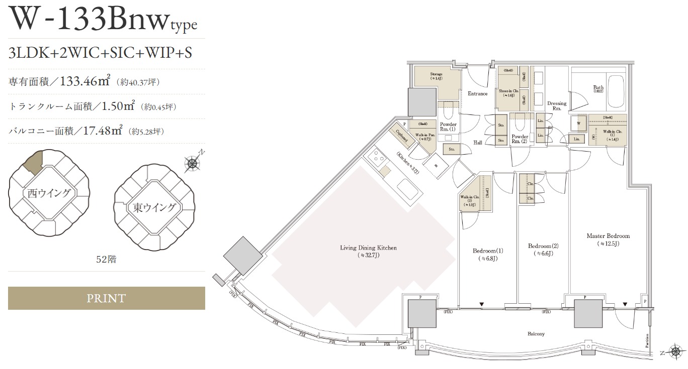 ¡¡À¾¥¦¥¤¥ó¥°¤Î52³¬¤ËÇÛÃÖ¤µ¤ì¤ë¥×¥ì¥ß¥¢¥à¥×¥é¥ó¤È¤Ê¤ëW-133Bnw¥¿¥¤¥×¤Î´Ö¼è¤ê¿Þ¤Ç¤¹¡£´Ö¼è¤ê¤Ï3LDK+2WIC+SIC+WIP+S¡¢ÀìÍÌÌÀѤÏ133.46Ö¡¢¥È¥é¥ó¥¯¥ë¡¼¥àÌÌÀѤÏ1.50Ö¡¢¥Ð¥ë¥³¥Ë¡¼ÌÌÀѤÏ17.48֤ǡ¢ÈÎÇä²Á³Ê¤Ï5²¯980Ëü±ß¤È¤Ê¤Ã¤Æ¤¤¤Þ¤¹¡£Âè2´ü1¼¡¤Ç°ìÈֹ⤤Éô²°¤È¤Ê¤ê¤Þ¤¹¡£