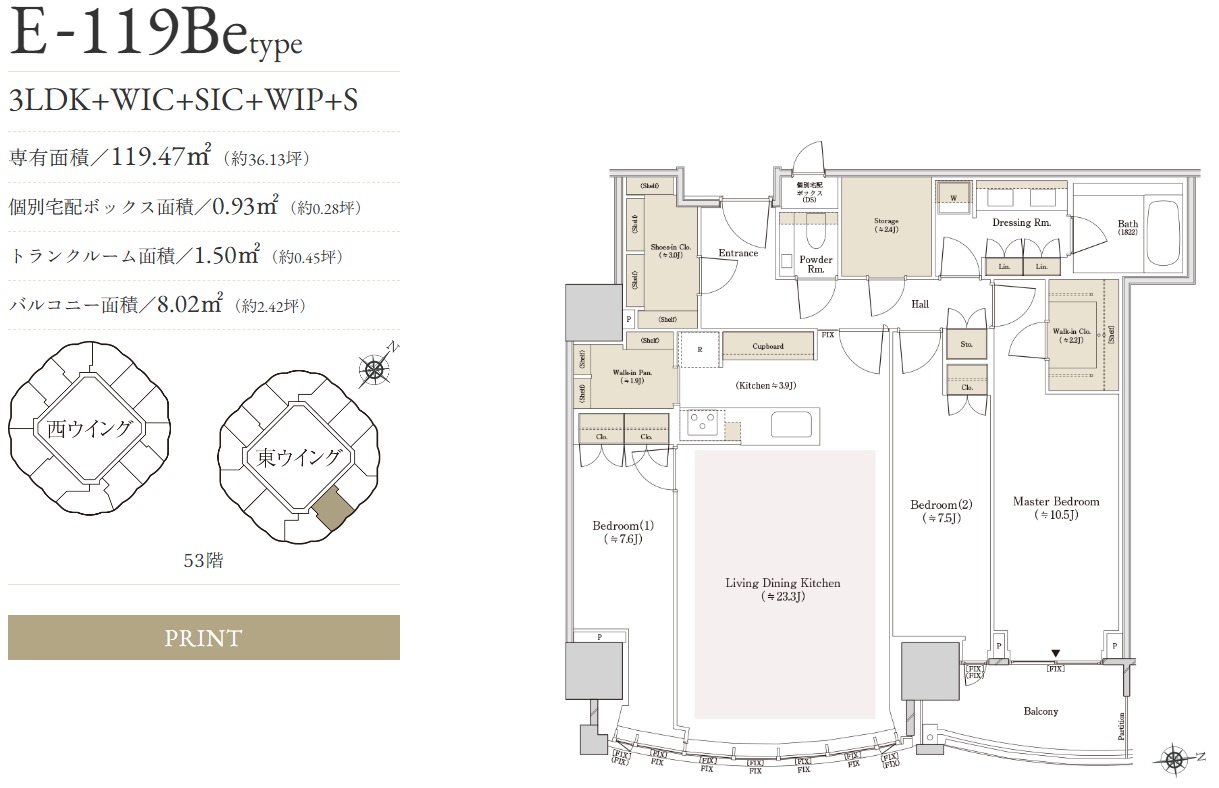¡¡Å쥦¥¤¥ó¥°¤Î53³¬¤ËÇÛÃÖ¤µ¤ì¤ë¥×¥ì¥ß¥¢¥à¥×¥é¥ó¤È¤Ê¤ëE-119Be¥¿¥¤¥×¤Î´Ö¼è¤ê¿Þ¤Ç¤¹¡£´Ö¼è¤ê¤Ï3LDK+WIC+SIC+WIP+S¡¢ÀìÍÌÌÀѤÏ119.47Ö¡¢¸ÄÊÌÂðÇۥܥ寥¹ÌÌÀѤÏ0.93Ö¡¢¥È¥é¥ó¥¯¥ë¡¼¥àÌÌÀѤÏ1.50Ö¡¢¥Ð¥ë¥³¥Ë¡¼ÌÌÀѤÏ8.02֤ǡ¢ÈÎÇä²Á³Ê¤Ï4²¯7000Ëü±ß¤È¤Ê¤Ã¤Æ¤¤¤Þ¤¹¡£