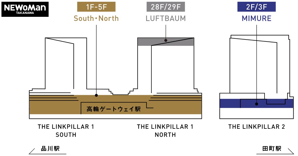 ¡¡¡ÖNEWoMan TAKANAWA¡Ê¥Ë¥å¥¦¥Þ¥ó¹âÎØ¡Ë¡×¤Ï¡¢THE LINKPILLAR 1 SOUTH¡Ê¥¶¡¡¥ê¥ó¥¯¥Ô¥é¡¼ ¥ï¥ó¡¡¥µ¥¦¥¹¡Ë¤Î1¡Á5³¬¤ËÆþ¤ëSouth¡¦North¡Ê¥µ¥¦¥¹¡¦¥Î¡¼¥¹¡§154ŹÊޡˤÈ28¡Á29³¬¤ËÆþ¤ëLUFTBAUM¡Ê¥ë¥Õ¥È¥Ð¥¦¥à¡§11ŹÊÞ¡Ë¡¢¤½¤·¤Æ¸½ºß·úÀßÃæ¤ÎTHE LINKPILLAR 2¡Ê¥¶¡¡¥ê¥ó¥¯¥Ô¥é¡¼ ¥Ä¡¼¡Ë¤Î2¡Á3³¬¤ËÆþ¤ëMIMURE¡Ê¥ß¥à¥ì¡§Ìó20ŹÊޡˤÎ3¤Ä¤Ëʬ¤«¤ì¤Æ¤¤¤Þ¤¹¡£