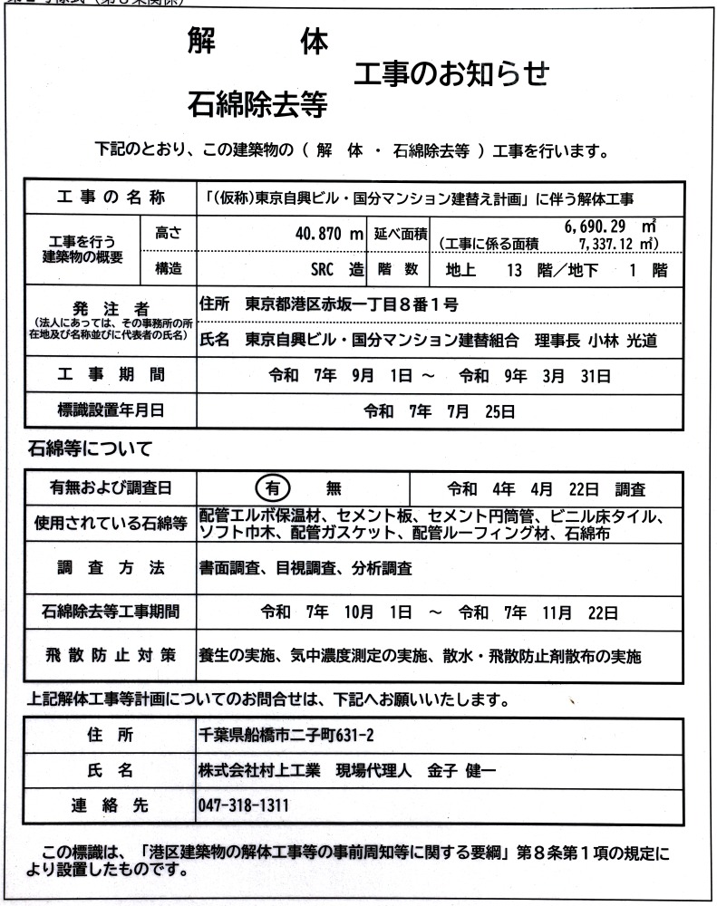 ¡¡´û¸·úʪ¤Î¡ÖÅìµþ¼«¶½¥Ó¥ë¡¦¹ñʬ¥Þ¥ó¥·¥ç¥ó¡×(ÃϾå13³¬¡¢¹â¤µ40.87m¡¢1968ǯ1·î½×¹©)¤Î²òÂι©»ö¤Î¤ªÃΤ餻¤Ç¤¹¡£²òÂΤλܹ©¼Ô¤Ï¼¾å¹©¶È¡¢²òÂι©´ü¤Ï2025ǯ9·î1Æü¤«¤é2027ǯ3·î31Æü¤Þ¤Ç¤È¤Ê¤Ã¤Æ¤¤¤Þ¤¹¡£