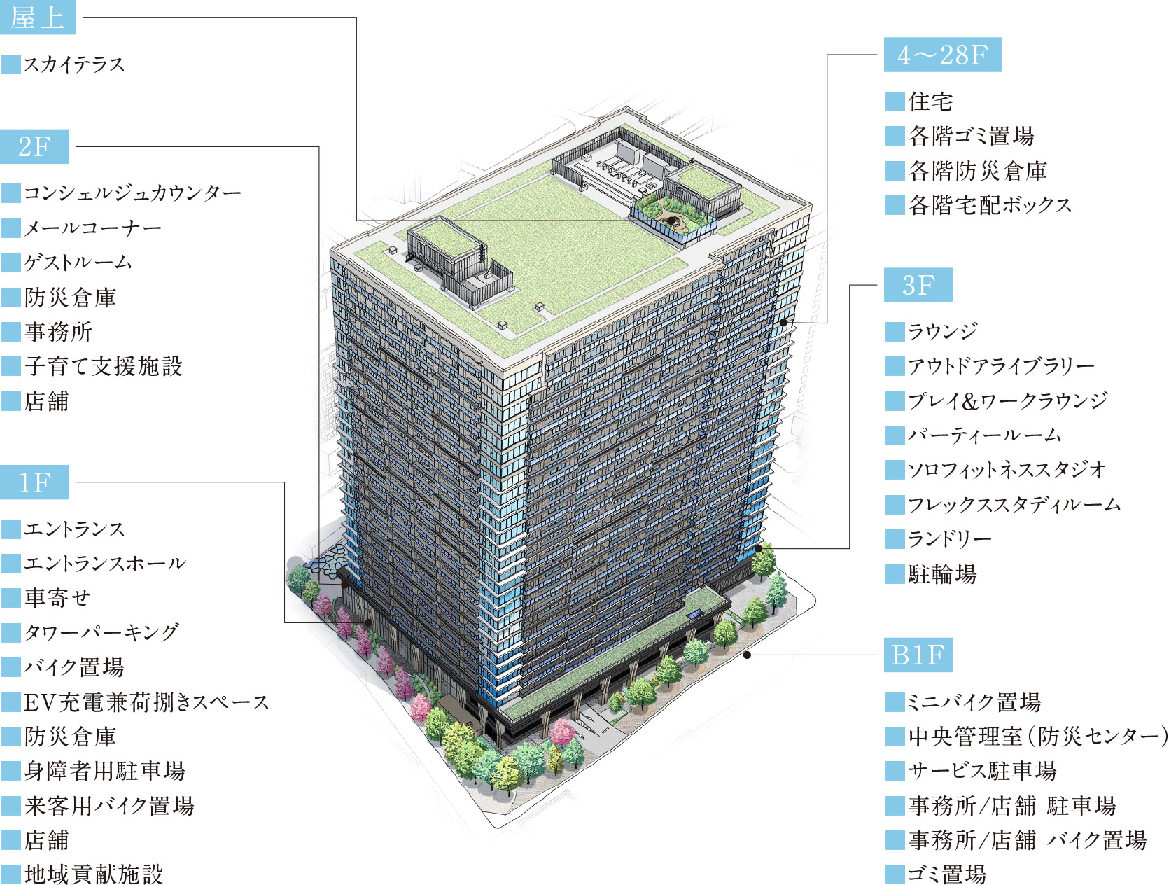 ¡¡1³¬¤Ë¤ÏŹÊÞ¤äÃϰè¹×¸¥»ÜÀß¡¢2³¬¤Ë¤ÏŹÊÞ¡¢»Ò°é¤Æ»Ù±ç»ÜÀß¡¢¥²¥¹¥È¥ë¡¼¥à5¼¼¡¢3³¬¤Ë¤Ï¥é¥¦¥ó¥¸¤ä¥Ñ¡¼¥Æ¥£¥ë¡¼¥à¤Ê¤É¤Î¥Þ¥ó¥·¥ç¥ó¶¦ÍÑ»ÜÀߤ¬½¸¤á¤é¤ì¡¢²°¾å¤Ë¤Ï¥¹¥«¥¤¥Æ¥é¥¹¤¬ÇÛÃÖ¤µ¤ì¤Þ¤¹¡£½»Âð¥Õ¥í¥¢¤Ï4³¬¡Á28³¬¤Ç¡¢³Æ³¬¤Ë¤Ï¥´¥ßÃ־졢ËɺÒÁҸˡ¢ÂðÇۥܥ寥¹¤¬ÀßÃÖ¤µ¤ì¤Þ¤¹¡£