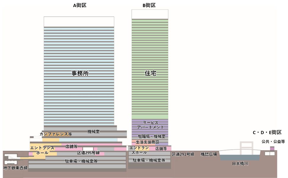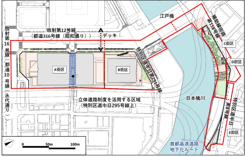¡¡·×²èÃϤÏÅìµþ¥á¥È¥íÅìÀ¾Àþ¡ÖÆüËܶ¶¡×±Ø¤ÈÅÔ±ÄÀõÁðÀþ¡ÖÆüËܶ¶¡×±Ø¤ËÎÙÀܤ·¤¿¾ì½ê¤Ç±ØÄ¾·ë¤È¤Ê¤ê¤Þ¤¹¡£A¡¦B³¹¶è¤ÎÅ즤ϼóÅÔ¹âC1¡¢C¡¦D¡¦E³¹¶è¤Ï¹¾¸Í¶¶JCT¤ËÌ̤·¤¿¾ì½ê¤È¤Ê¤Ã¤Æ¤¤¤Þ¤¹¡£¤Þ¤¿¡¢À¾Â¦¤Î¡ÖÆüËܶ¶°ìÃúÌÜÃæÃ϶è¡×¤Ç¤ÏÃϾå52³¬¡¢¹â¤µ283.96m¤Î͹âÁإӥ뤬·úÀßÃæ¤ÇÊâ¹Ô¼Ô¥Ç¥Ã¥¤Ë¤è¤Ã¤ÆÀܳ¤¹¤ë·×²è¤È¤Ê¤Ã¤Æ¤¤¤Þ¤¹¡£