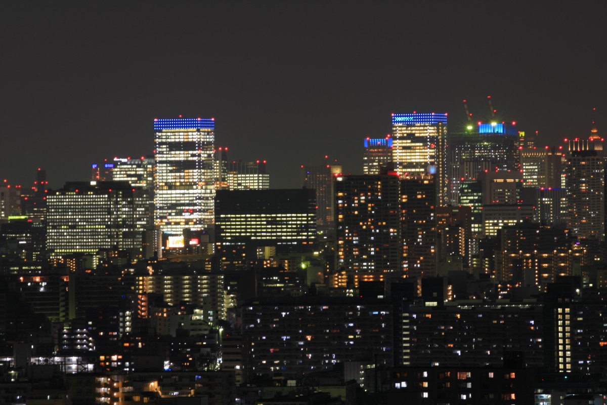 東京駅方面です。工事中のグラントウキョウ サウスタワーとグラントウキョウ ノースタワーが煌々と輝いていますが、その他のビルは眠っています。上の写真と違ってマンションの廊下や階段の明かりが少ないので、グラントウキョウが際立って見えます。 |