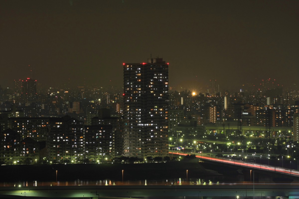 所変わって都営新宿線東大島駅近くのセーラ小松川で、地上33階、高さ103mのUR賃貸のタワーマンションです。そのマンションが偶然なのか何かのイベントだったのか、窓明かりが円を2つ描いていました。円が多少崩れているので多分偶然ですよね? |