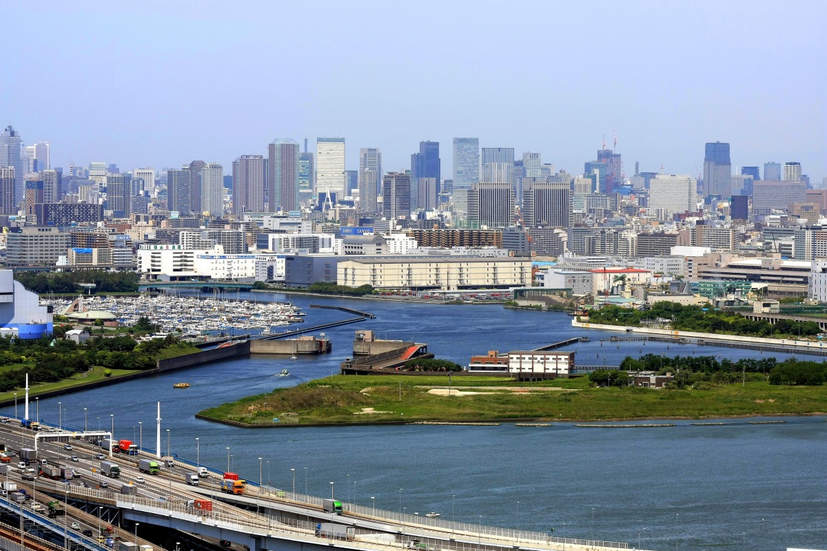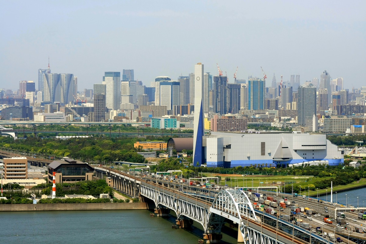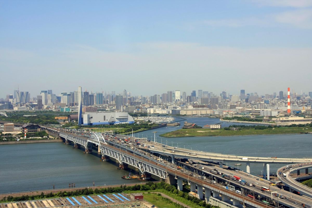 東雲方面です。東雲のタワーマンション群も密集しているイメージがありますが、こうして見ると結構距離を取って建てているのがわかります。 左奥には芝浦、田町、恵比寿あたりのビルやマンションが重なって見えています。一番右に見えるのはTHE TOKYO TOWERS、六本木ヒルズ、東京タワーです。 六本木ヒルズの左下あたりに見えるシドニーのオペラハウスのような建物は、東京辰巳国際水泳場です。 |