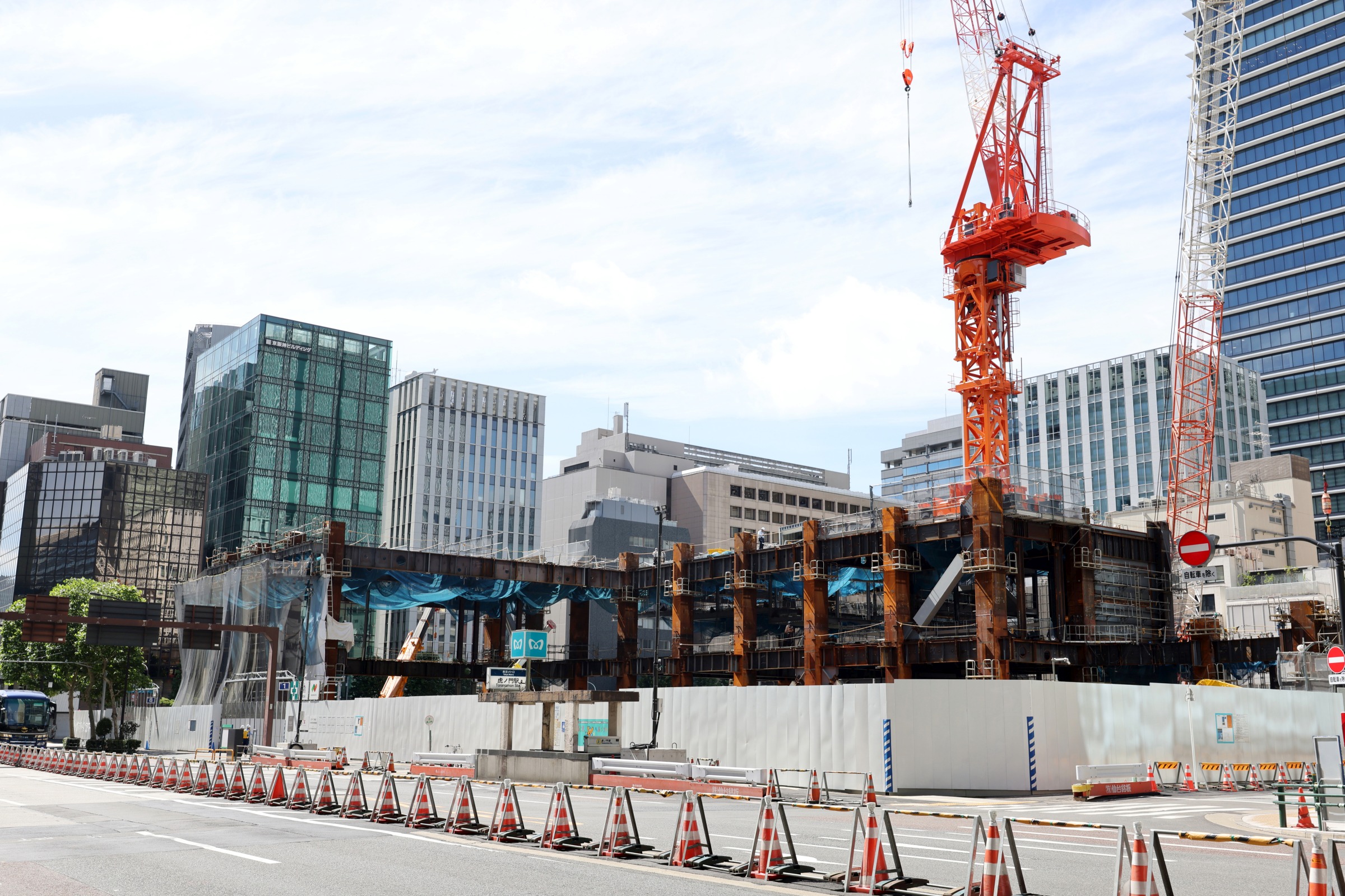 虎ノ門駅直結のオフィスビル「TORANOGATEトラノゲート)」(地上29階、高さ171.31m)の建設地です。2025年5月18日に撮影しました。同再開発は国家戦略特別区域計画の特定事業に指定されており、駅と一体となった国際的なビジネス交流拠点になります。この記事では同再開発の概要や建設状況、地図等を載せています。