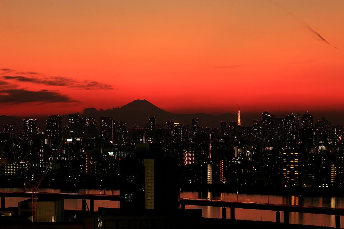 富士山と東京タワーと東京の超高層ビル群です。