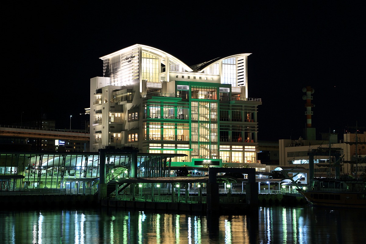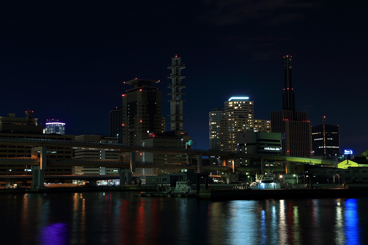 数週間前に神戸に行ったとき「ホテルオークラ神戸」(地上35階、高さ135m)に宿泊したのでその周辺の夜景です。中央がその「ホテルオークラ神戸」で左側のタワーが「神戸ポートタワー」(高さ108m)です。また、網の目状の建物が「神戸海洋博物館」です。