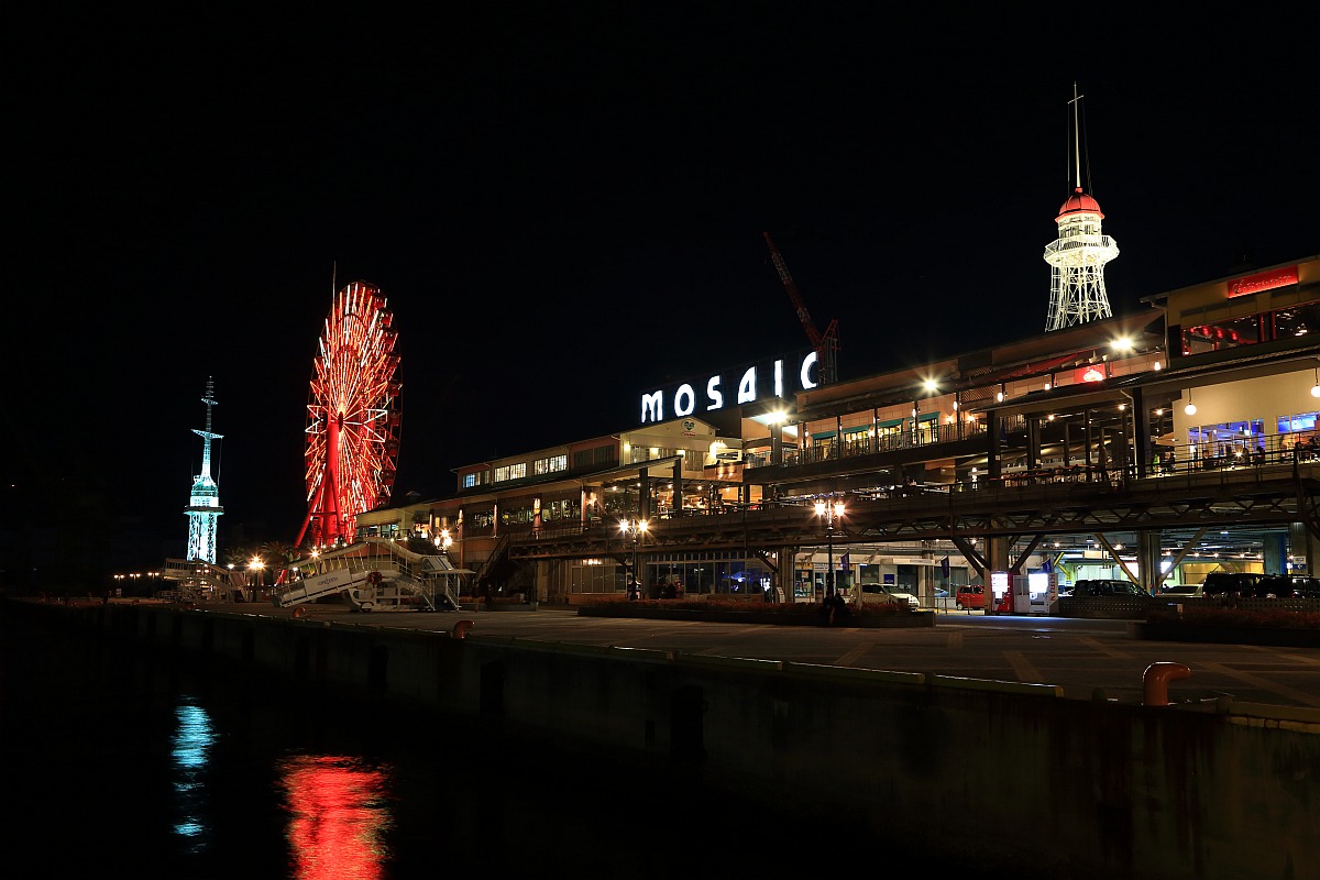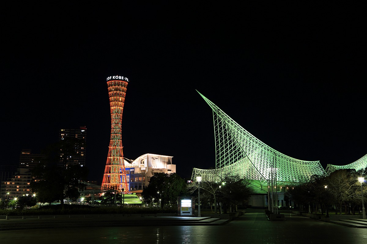 反対側から見た「神戸ポートタワー」と「神戸海洋博物館」です。「神戸ポートタワー」はどうやら30分ごとに縦のライトアップがあるようです。写真だとちょっとわかりにくいですね。