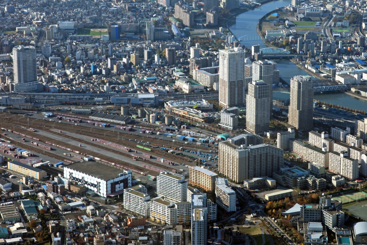 南側からの南千住の空撮です。 手前の大きな貨物駅は「隅田川駅」です。 貨物専用の駅で旅客列車は通りません。 中央の川が「隅田川」で 上に見える川が「荒川」です。 この両川に挟まれたところが「北千住」です。 |