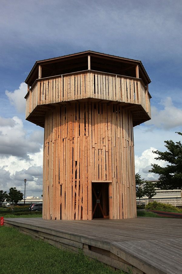 南千住の汐入公園内に設置されている 木造の「汐入タワー」です。 見ての通り高さはそれほどありませんが 360度の展望スペースがあります。 |