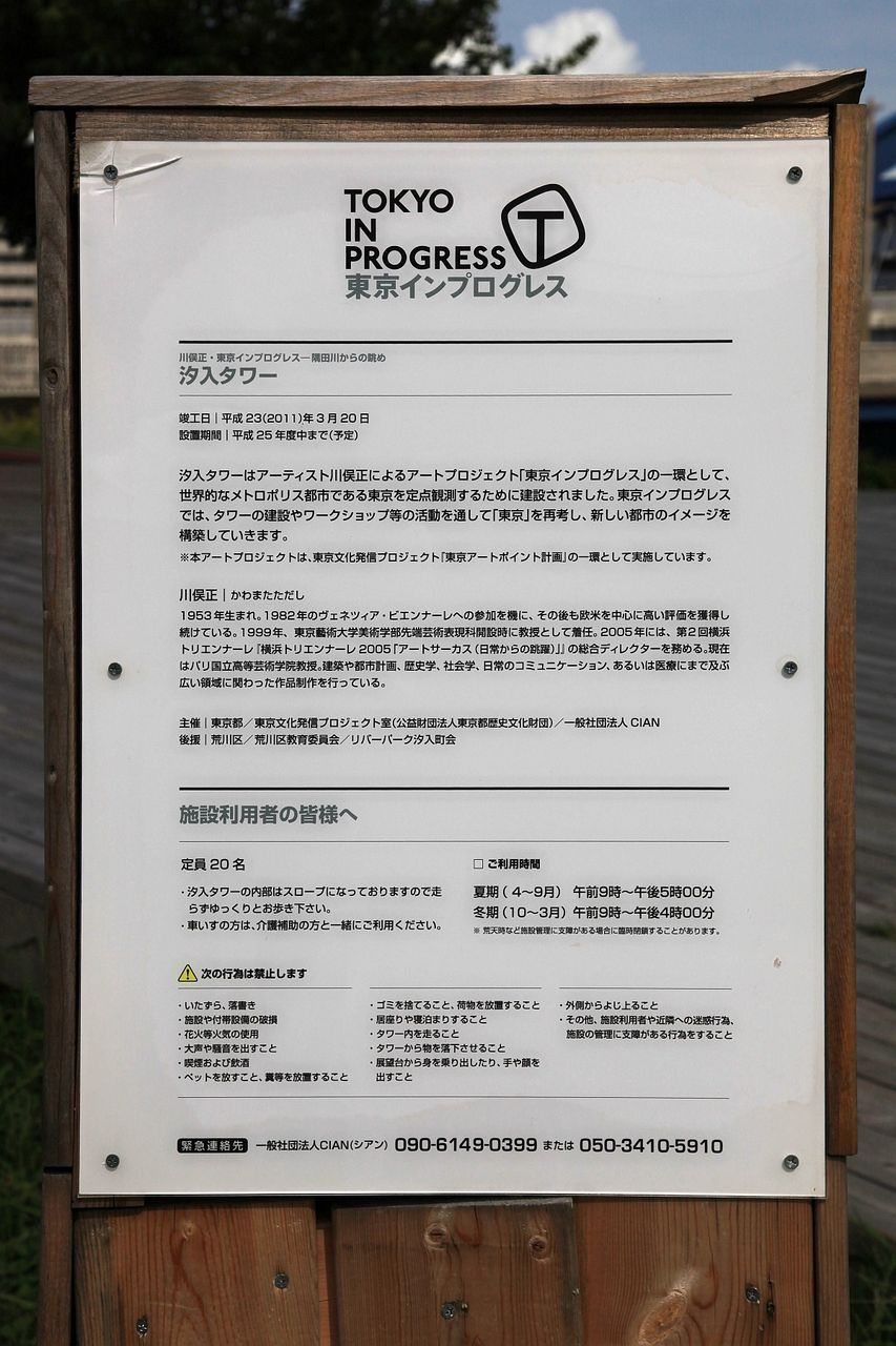 最後に「汐入タワー」の説明書きです。 川俣正氏によるアートプロジェクト 「東京インプログレス」の一環で 東京を定点観測するために建設されたそうです。 そしてこの施設を利用出来る時間は 夏季(4〜9月)午前9時〜午後5時 冬季(10〜3月)午前9時〜午後4時 です。 設置期間は25年度中までを予定とのことなので 興味がある人はお早めに! というか、このまま常設しておいて欲しい施設です。 人気ブログランキンに参加しています。 ポチッとして頂けると順位を見ることが出来ます。 でも同時にポイントも加算されます。 そんな本日もポチっとお願い致しますm(_ _)m ⇒ ここをクリック |