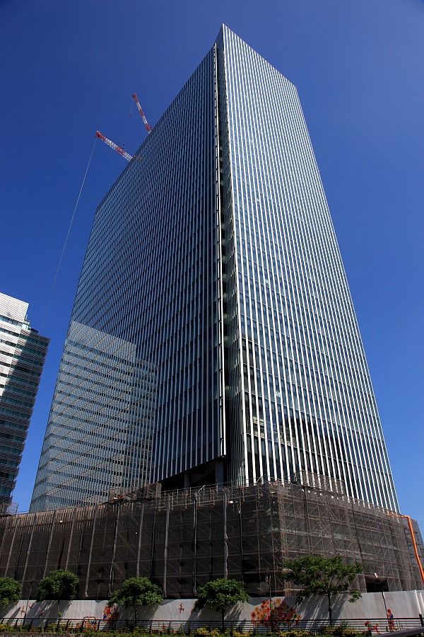2011年7月の建設中のオフィスビル 「横浜三井ビルディング」(地上30階、高さ153m)です。 外観は低層部を残してほぼ完成していました。 棟屋部が斜めになっているという ありそうであまりなかったデザインです。 |