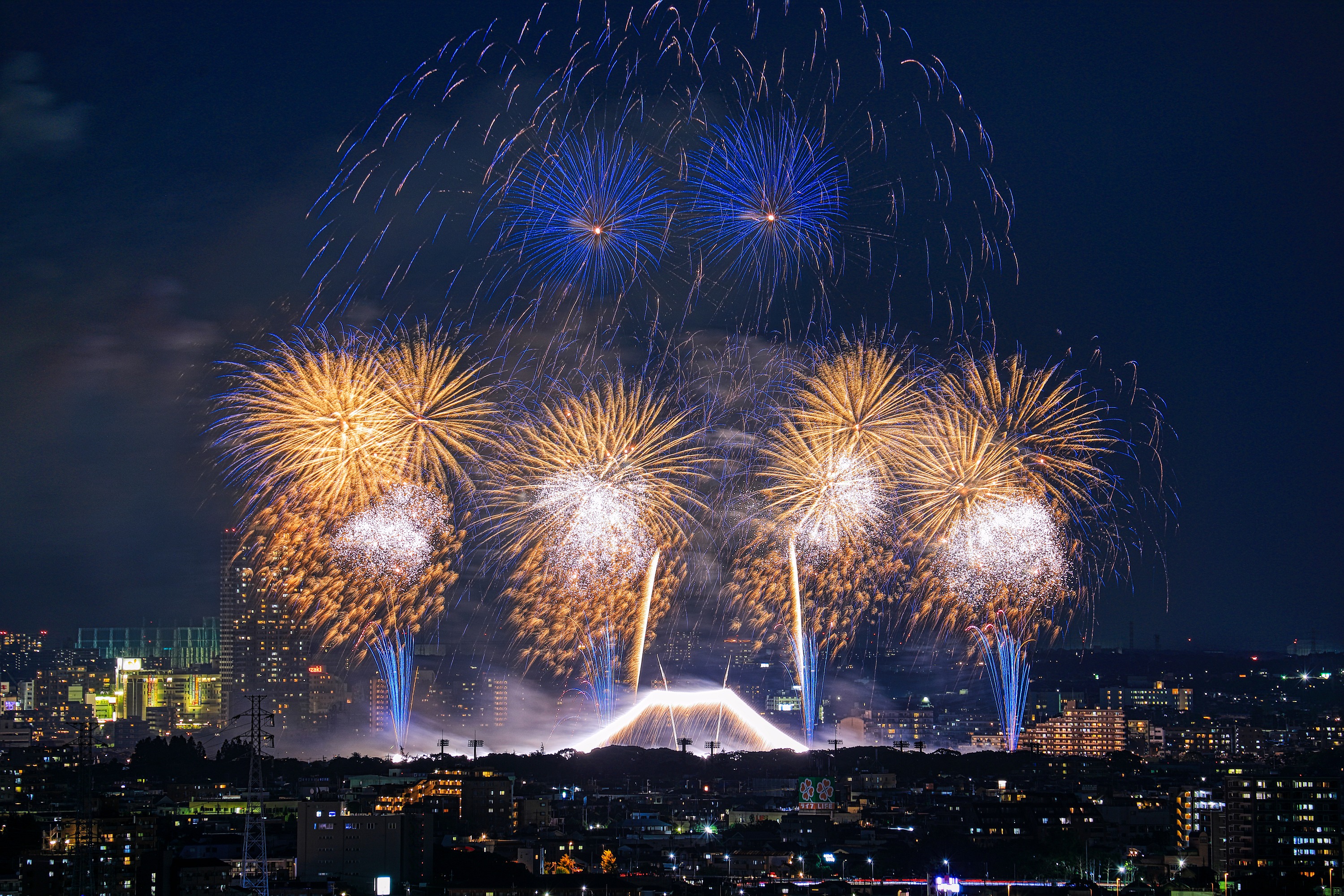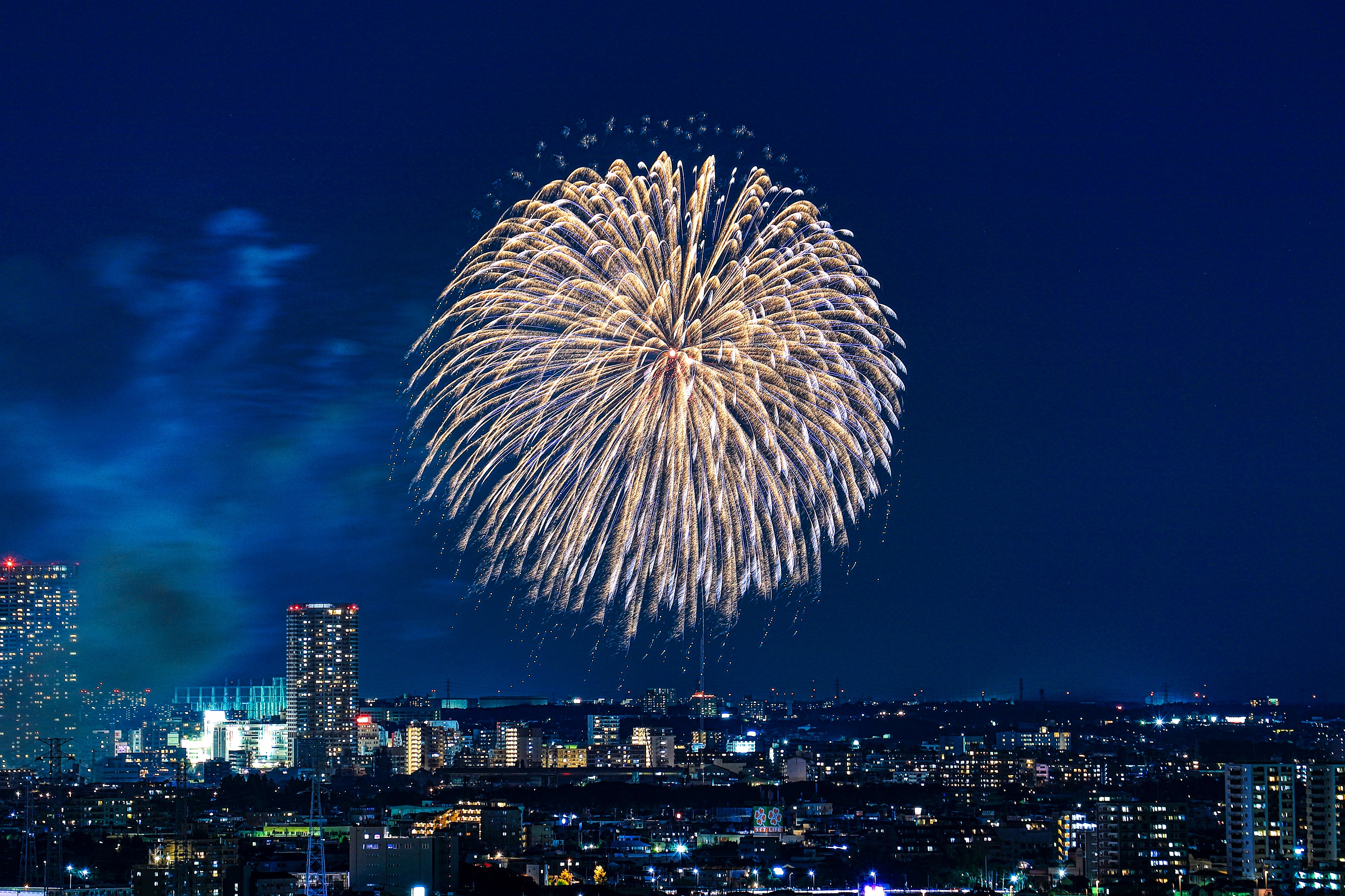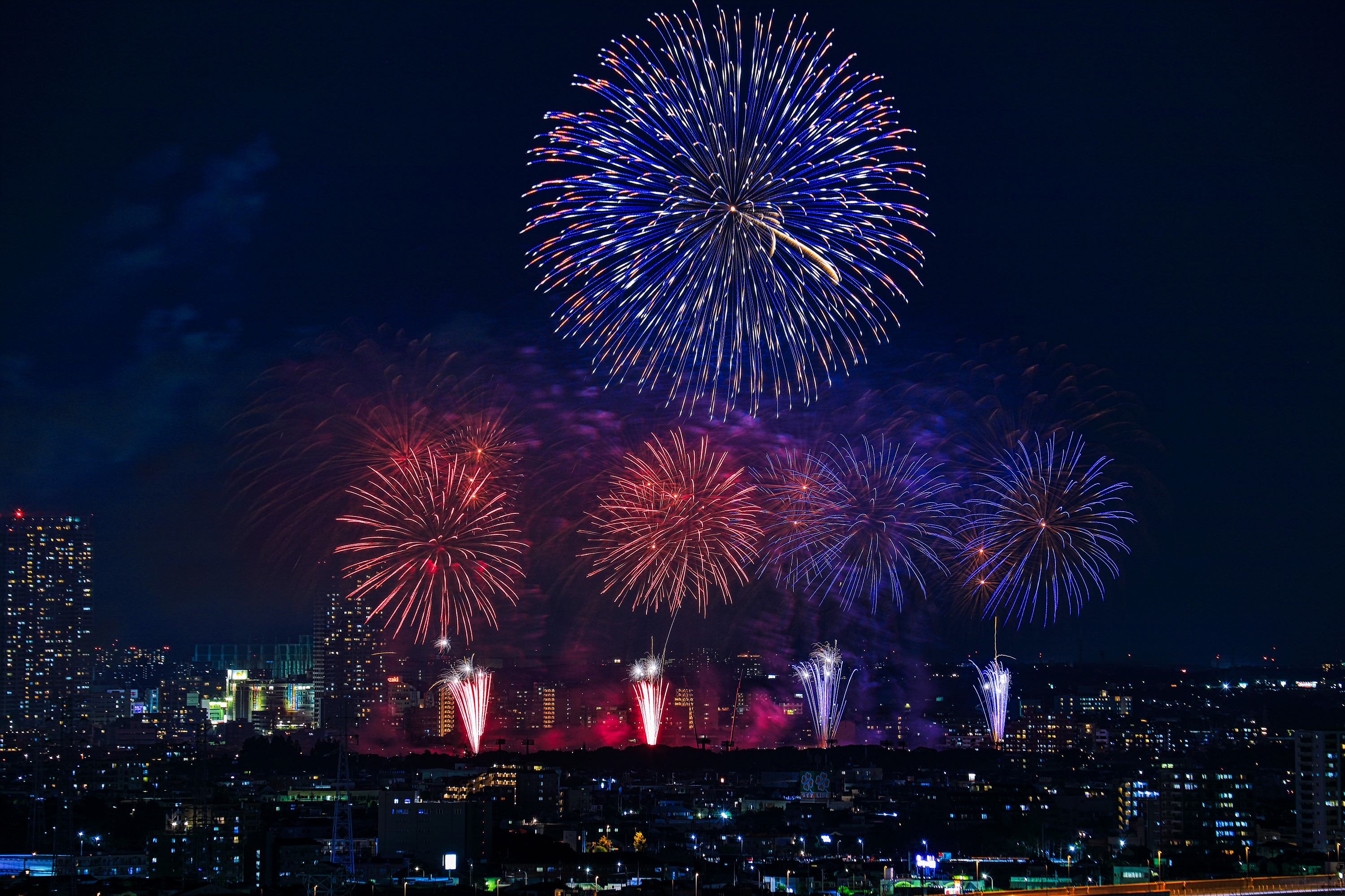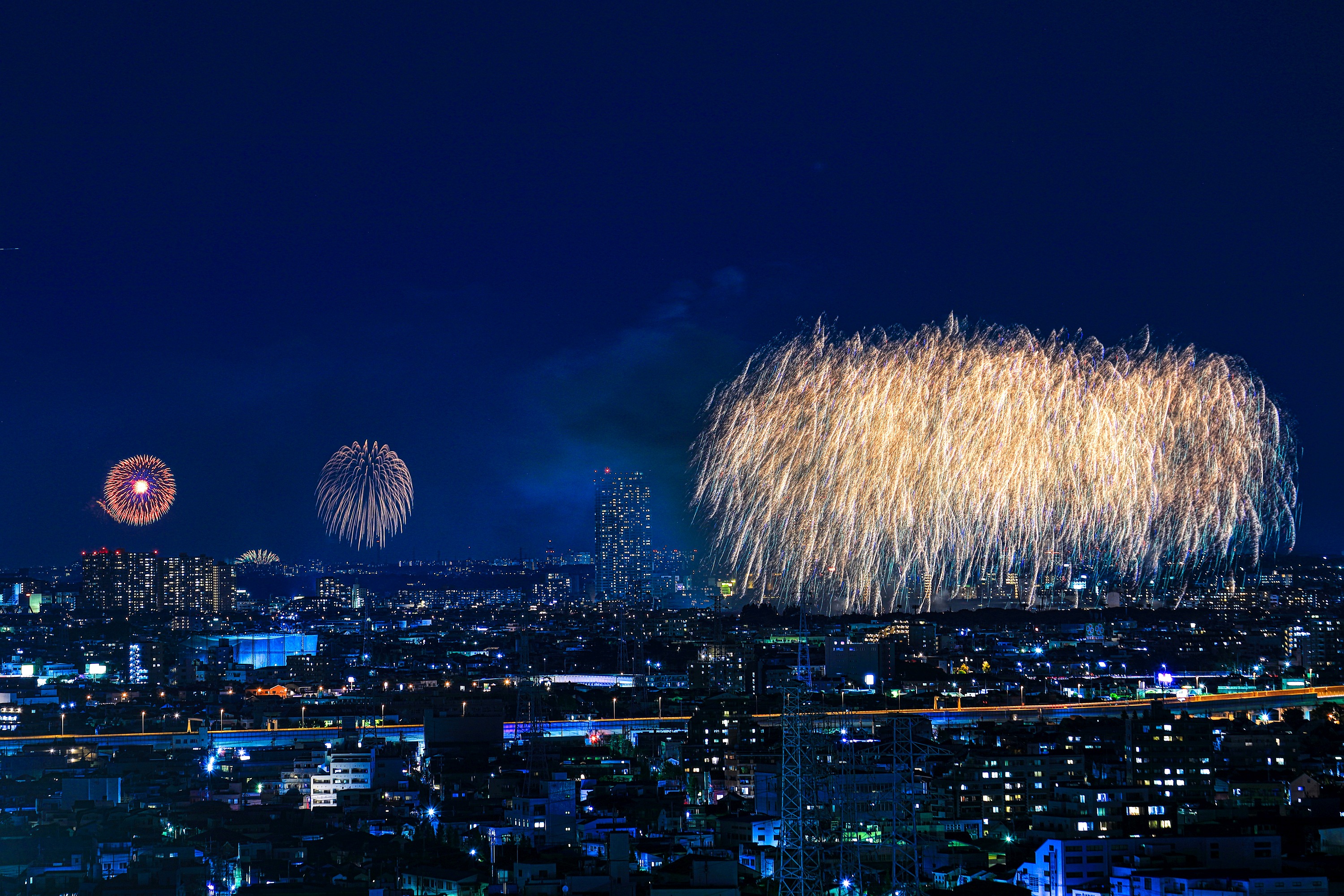 土曜にあった市川&江戸川の花火大会です。 正式には「江戸川区花火大会&市川市民納涼花火大会」で 二つの花火大会が合わさったものです。 近所では一番大きな花火大会で見ごたえがありました。 ちなみに左後ろに見えるタワーマンションは 市川駅前の「I-linkタウンいちかわ」で 地上45階、高さ160mと地上37階、高さ130mです。 やっぱり両方とも窓明かりが多いですね! では適当に写真を選んだのでズラズラ並べてみます。 | |