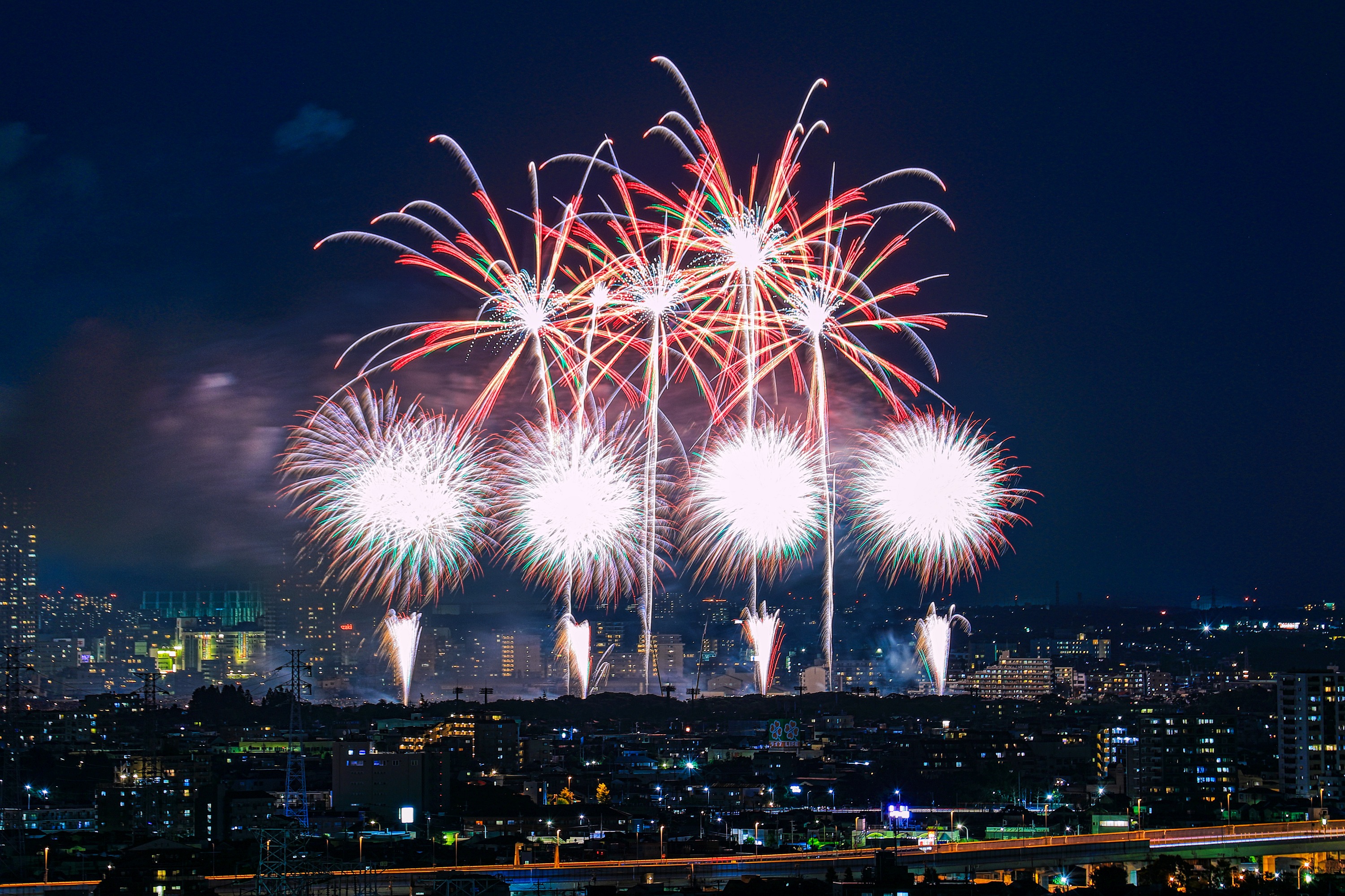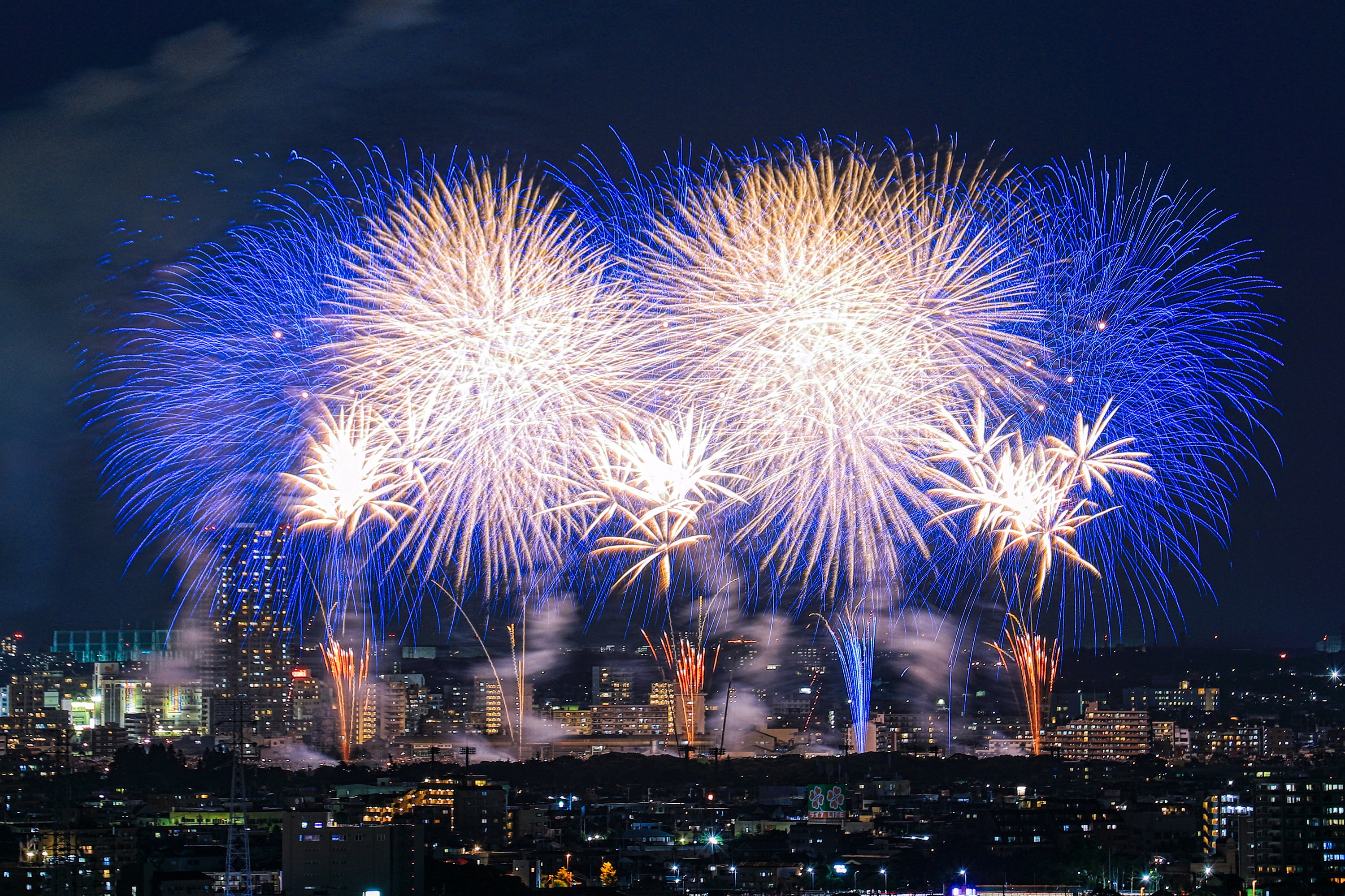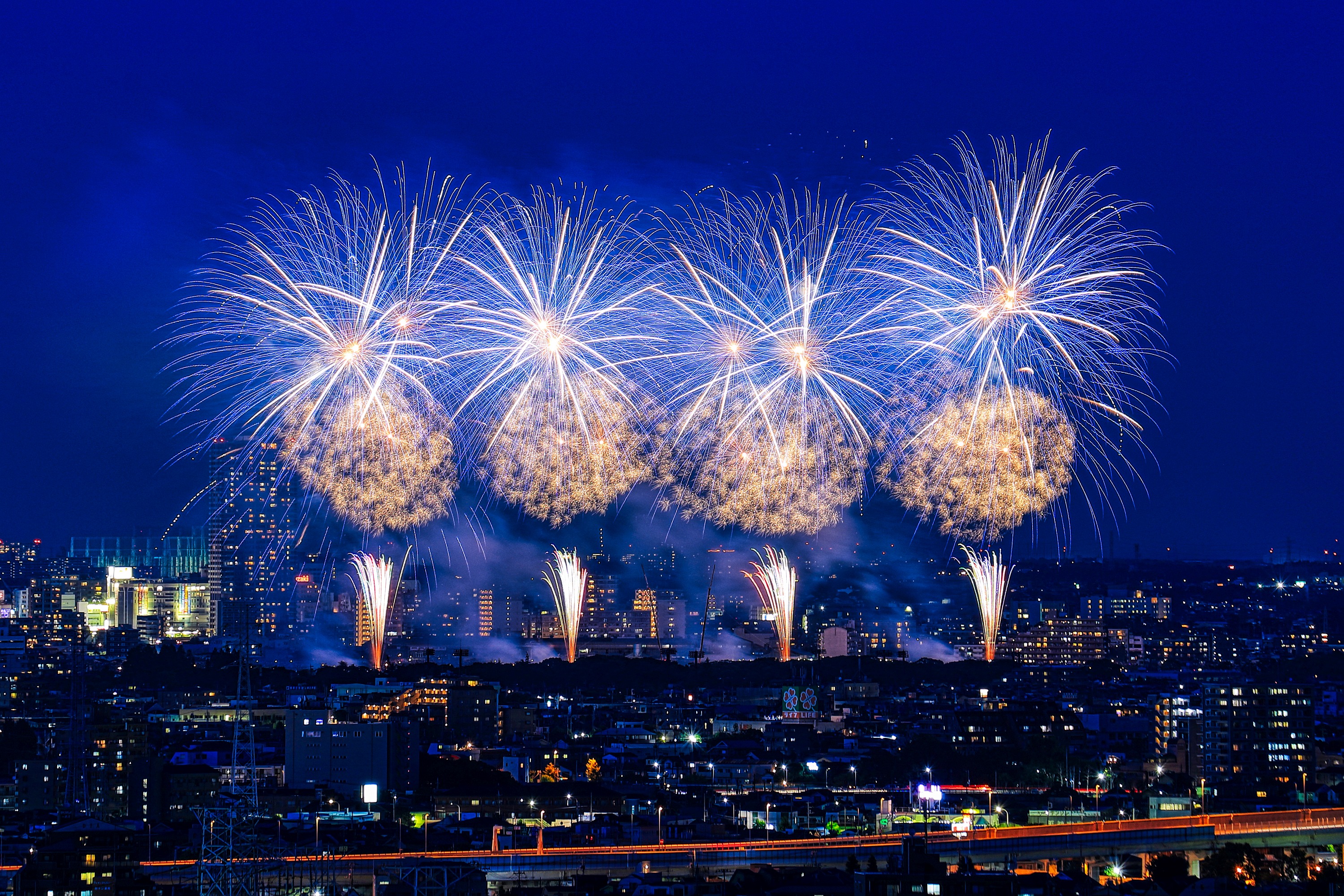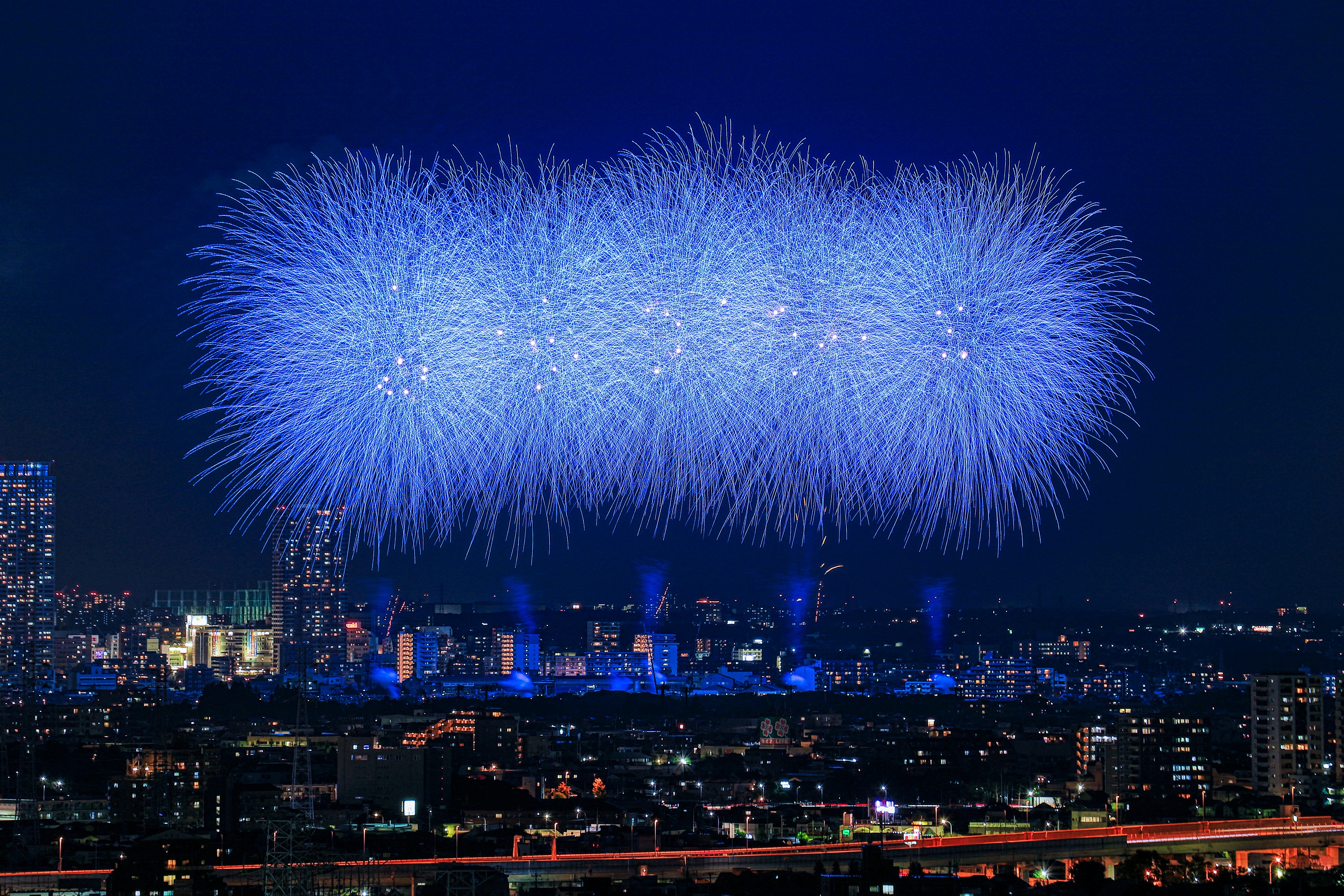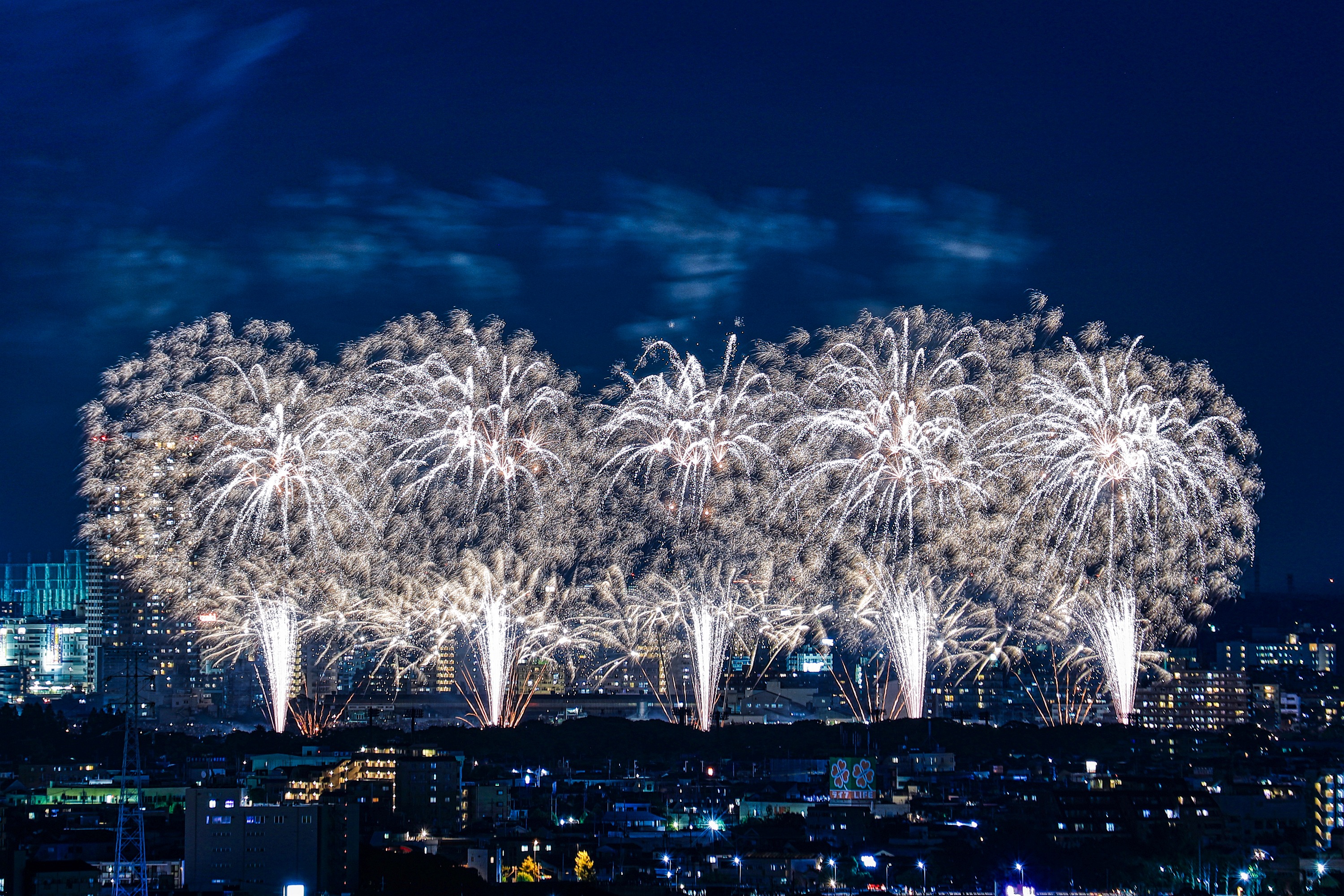 土曜にあった市川&江戸川の花火大会です。 正式には「江戸川区花火大会&市川市民納涼花火大会」で 二つの花火大会が合わさったものです。 近所では一番大きな花火大会で見ごたえがありました。 ちなみに左後ろに見えるタワーマンションは 市川駅前の「I-linkタウンいちかわ」で 地上45階、高さ160mと地上37階、高さ130mです。 やっぱり両方とも窓明かりが多いですね! では適当に写真を選んだのでズラズラ並べてみます。 | |