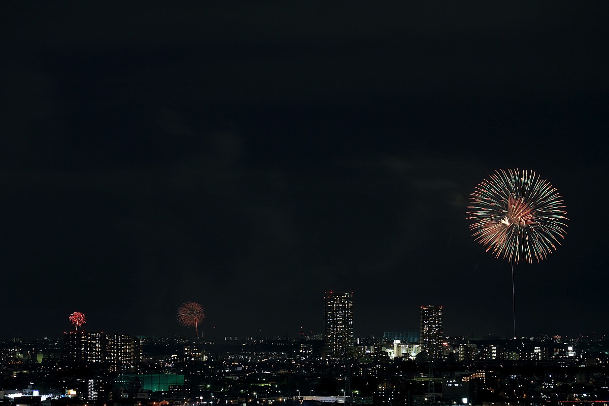 市川・江戸川の花火大会の左の方では 他の花火大会も見えていました。 どこでしょうか? これ以外にもちょうど北側でも 花火大会が見えていました。 あとは東京スカイツリー定点観測所に2枚だけ載せましたが 「いたばし花火大会」も見えていました。 写真はありませんが東側でも2箇所 船堀から見て南千住側の方向でも1箇所 あちこちで花火が見える一日でした。 | |