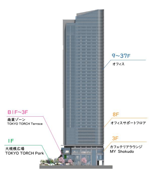¡¡¡ÖTOKYO TORCH¡×Á´ÂΤηúÀßÃÏÊýÌ̤Ǥ¹¡£º¸¤Î¹õ¤¤Ä¶¹âÁإӥ뤬ºòǯ½×¹©¤·¤¿¡Ö¾ïÈ×¶¶¥¿¥ï¡¼¡×(ÃϾå38³¬¡¢¹â¤µÌó212m)¤Ç¡¢¤½¤Î±¦Â¦¤ÎÊý¤Ë¡ÖTorch Tower¡×(ÃϾå63³¬¡¢¹â¤µÌó390m)¤¬·úÀߤµ¤ì¤Þ¤¹¡£